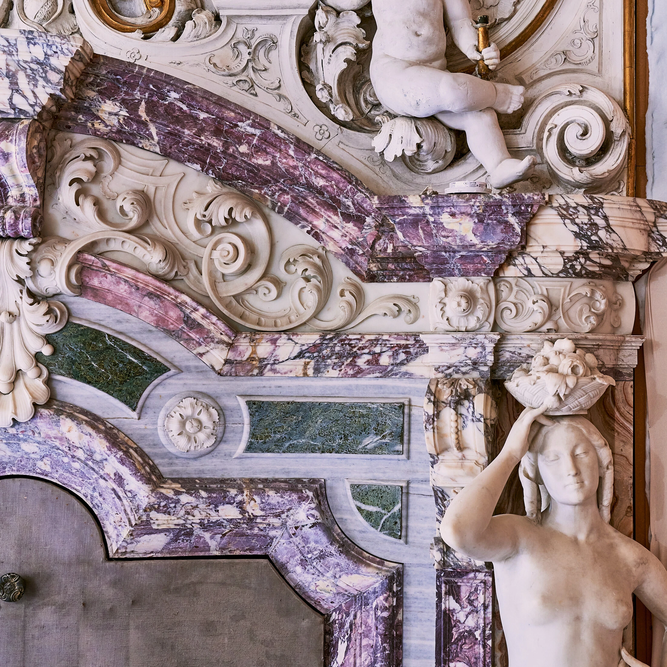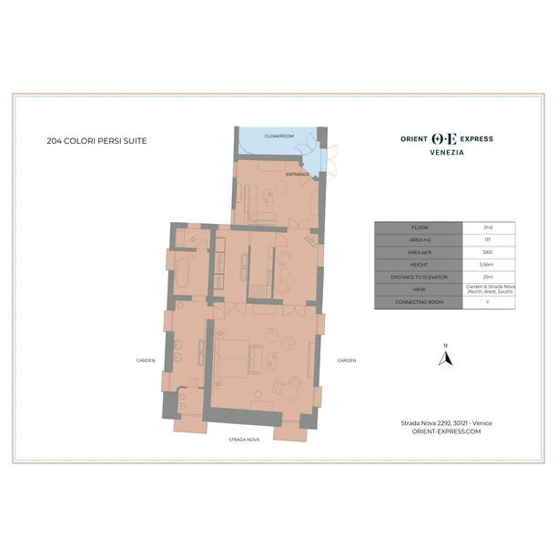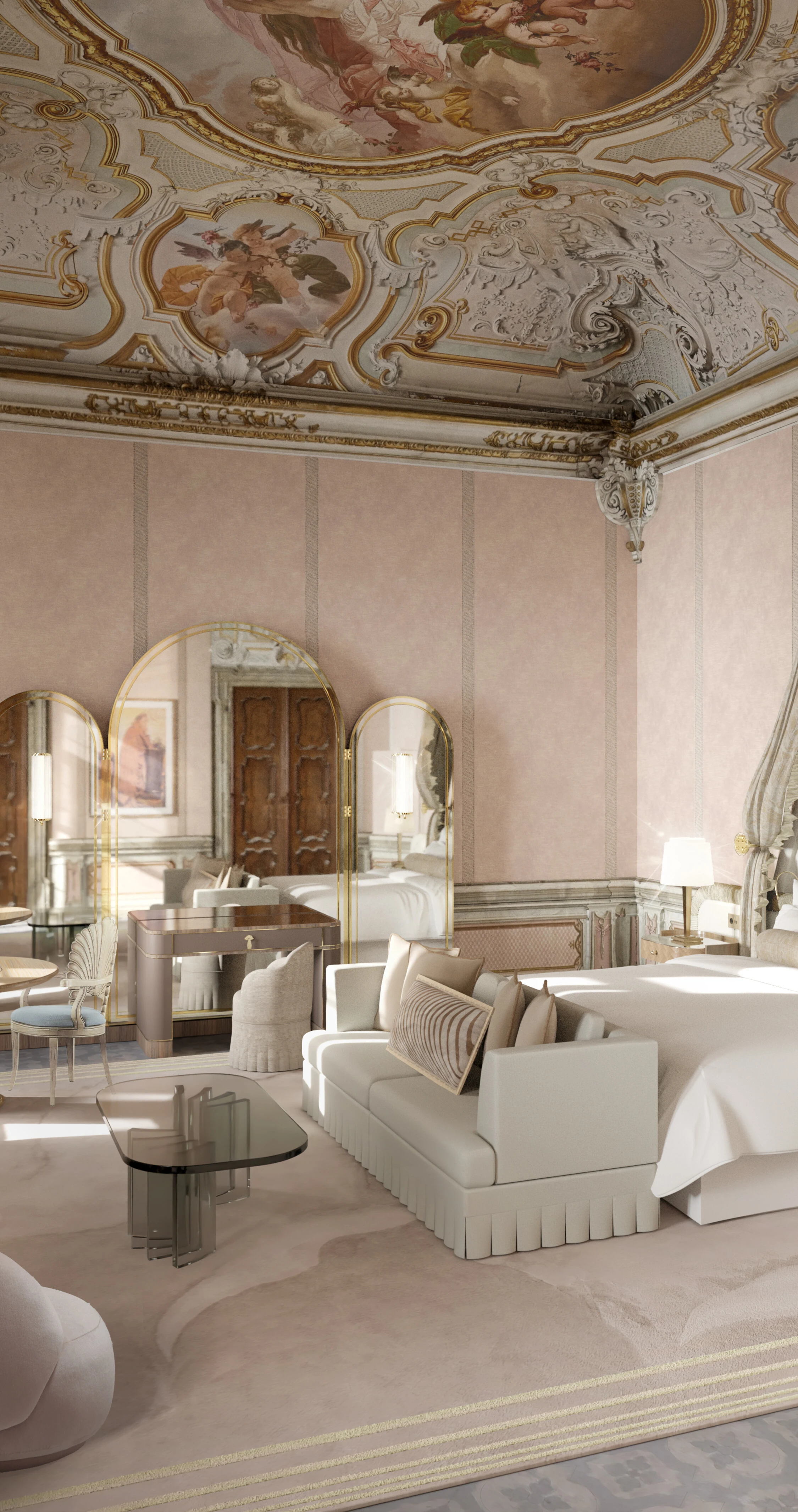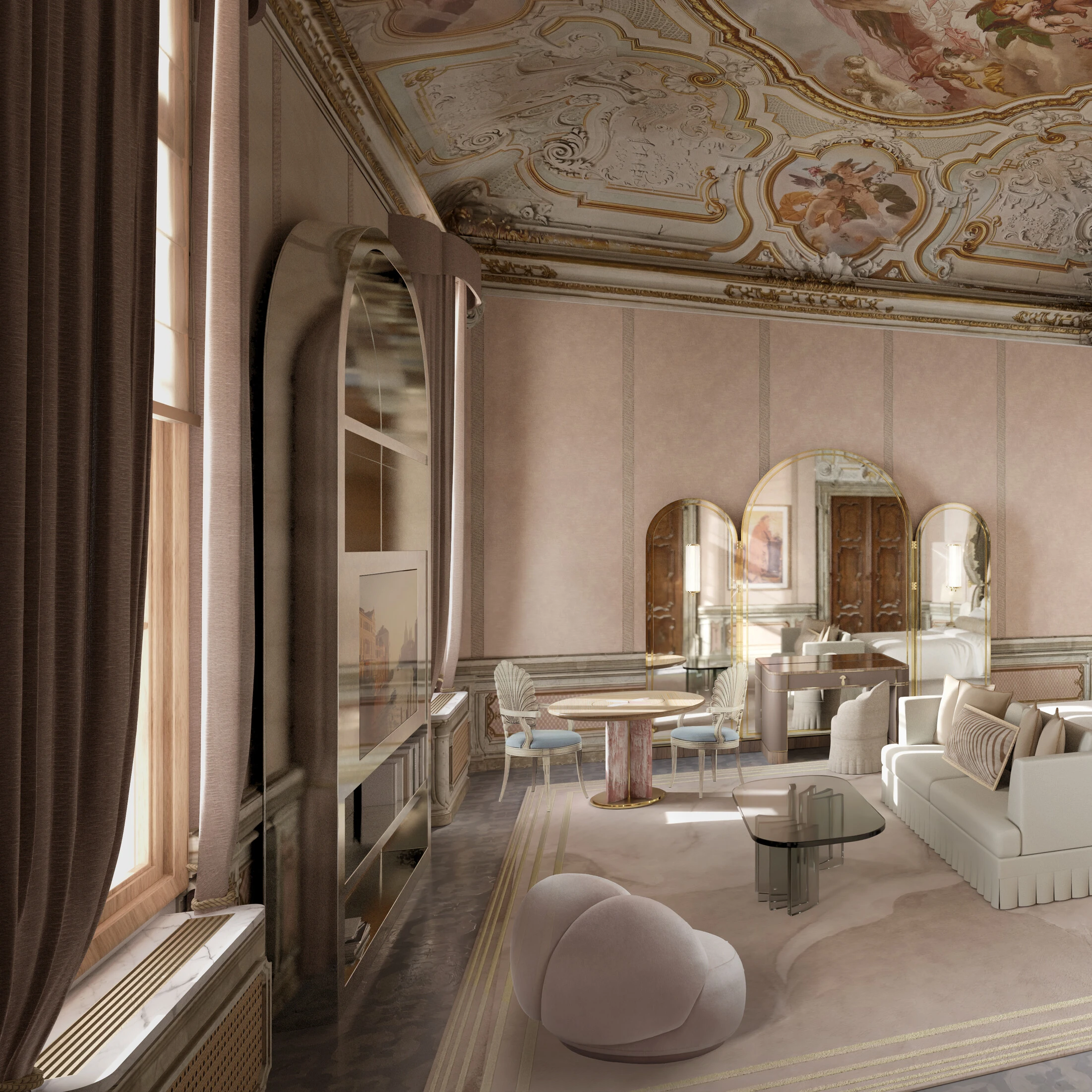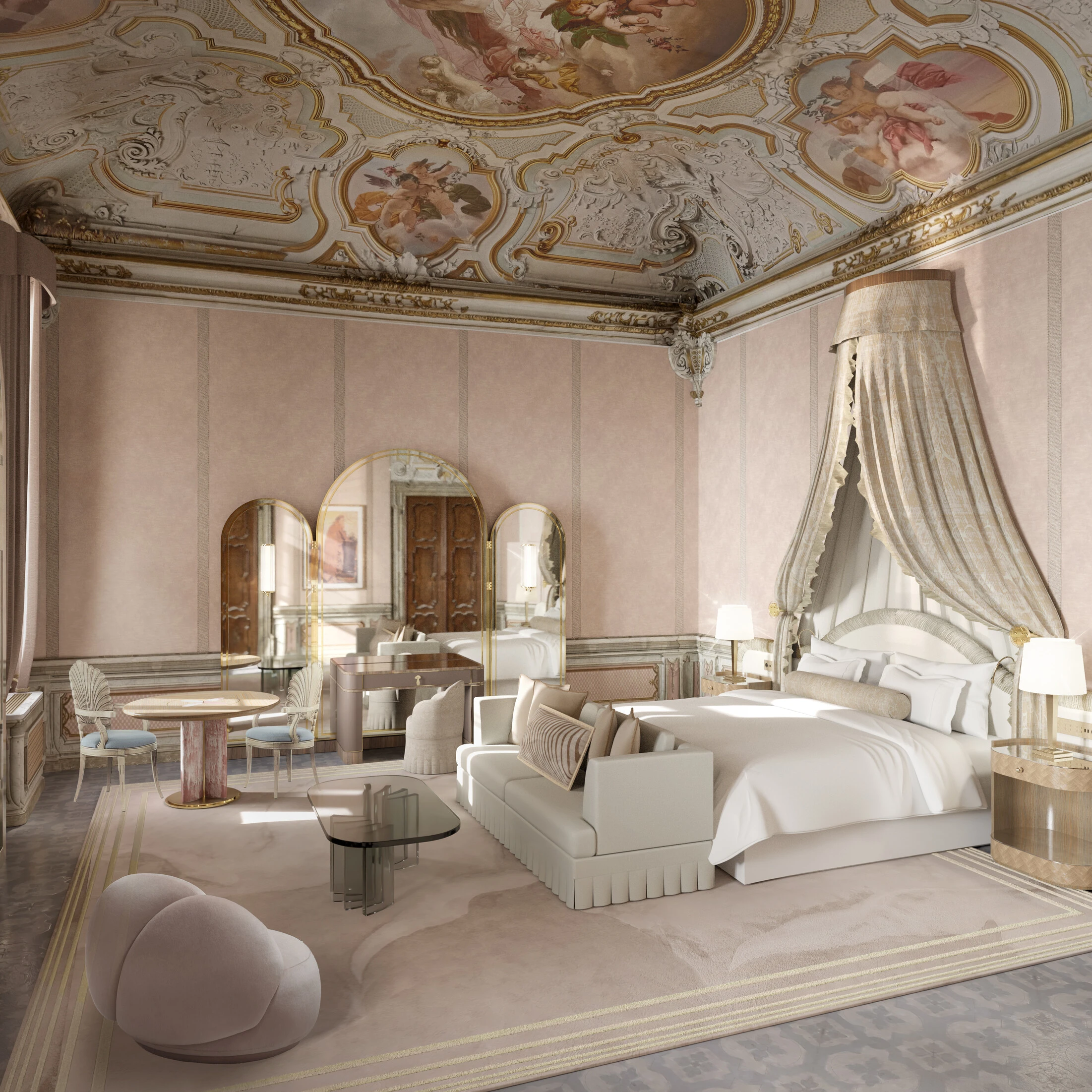 Inspired by 16th-century pigment names and poetic lore, Colori Persi means “lost colors.” Not gone, but rediscovered. This corner suite overlooks the Palazzo gardens and Strada Nova, crowned by an original 1860 Neo-Rococo fresco by Eugenio Moretti Larese. The salon is filled with natural light, set over Venetian terrazzo floors and framed by sculpted moldings and soft marmorino finishes. A full marble bathroom completes the suite, featuring dual basins, a walk-in shower and bathtub, alongside a dedicated dressing room designed for quiet rituals before the city calls again.