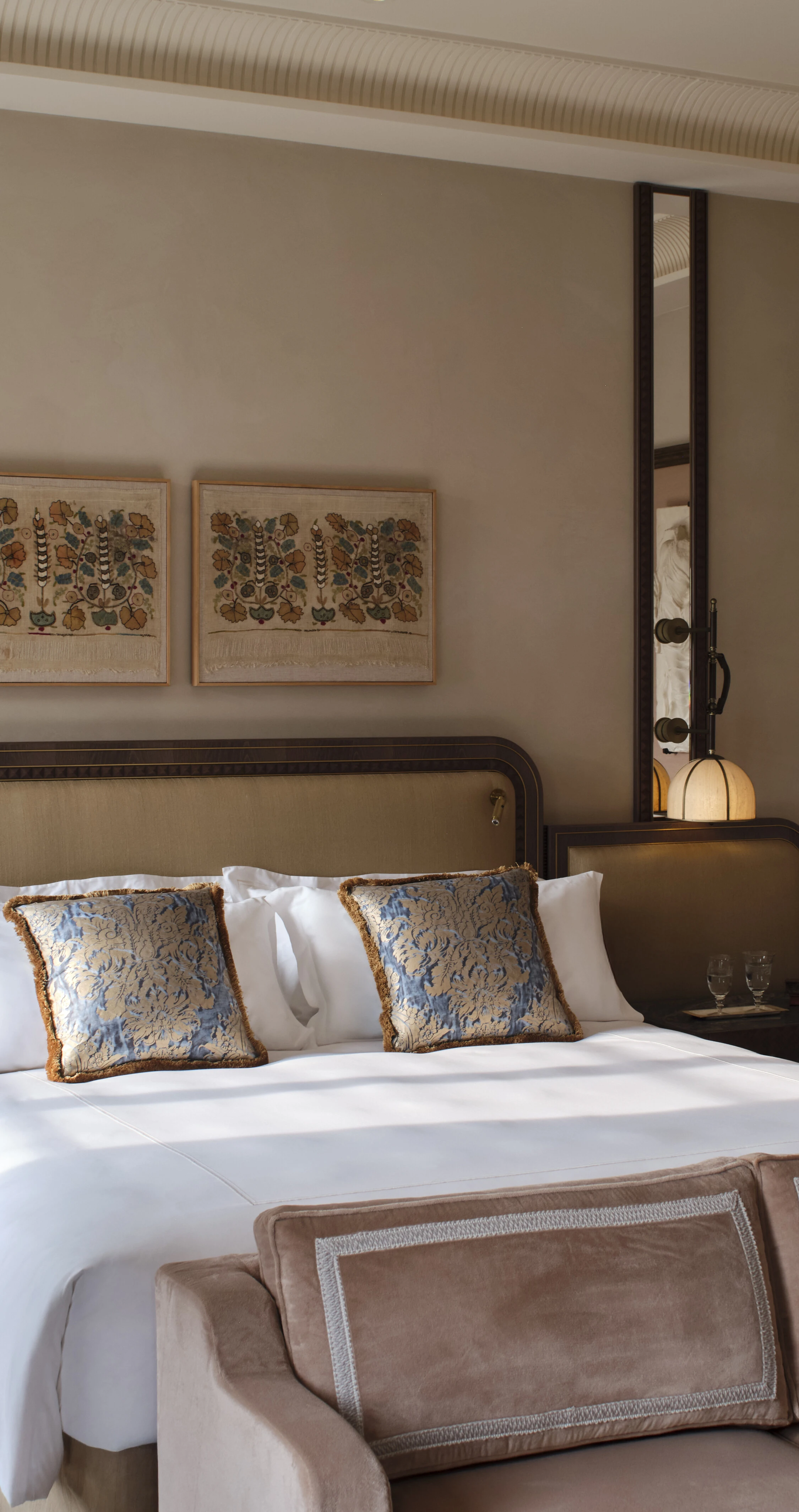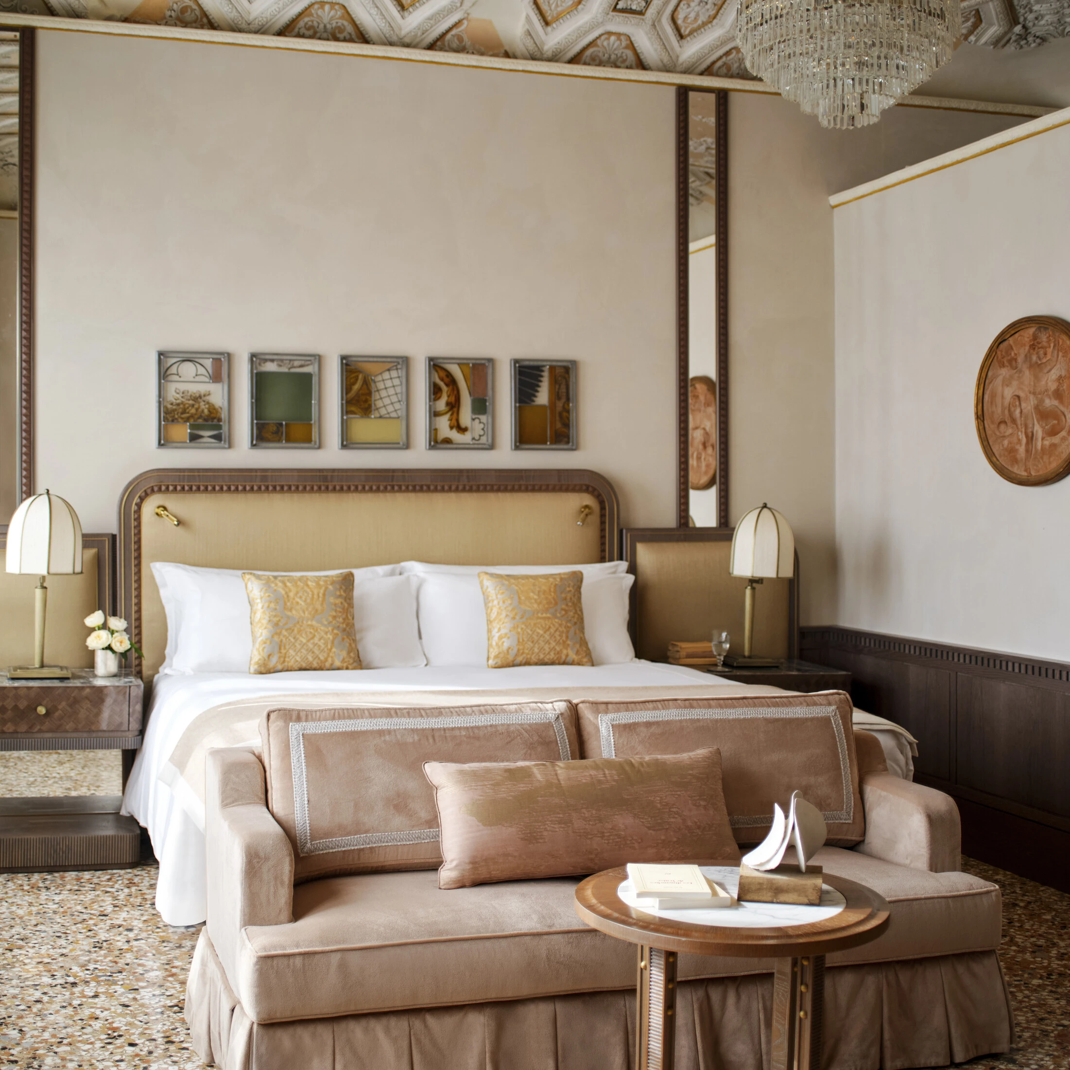 Generous deluxe rooms with a king-size bed and marble bathroom. Murano glass accents, embossed leathers, and custom furnishings. Luxurious linens, bespoke bathroom amenities, minibar with complimentary soft drinks, coffee and tea selection.