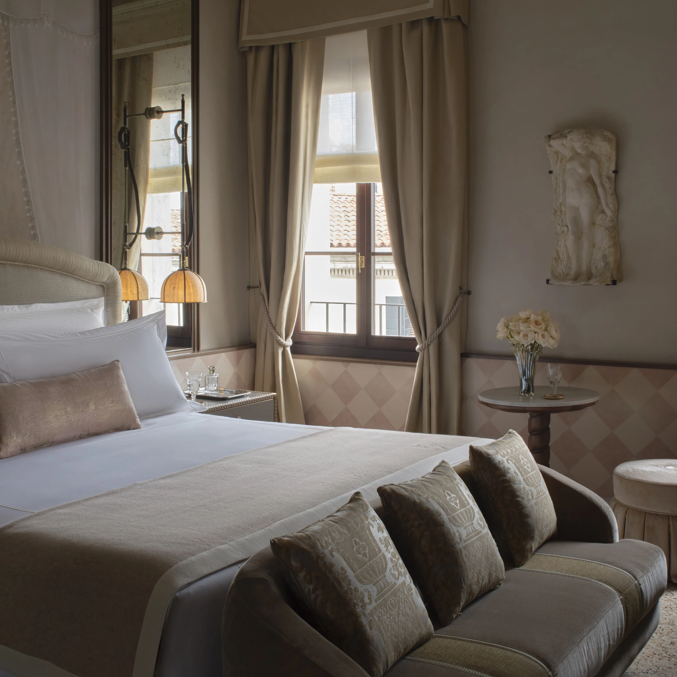 Elegant superior rooms with a king-size bed and marble bathroom. Murano glass accents, embossed leathers, and custom furnishings. Luxurious linens, bespoke bathroom amenities, minibar with complimentary soft drinks, coffee and tea selection.