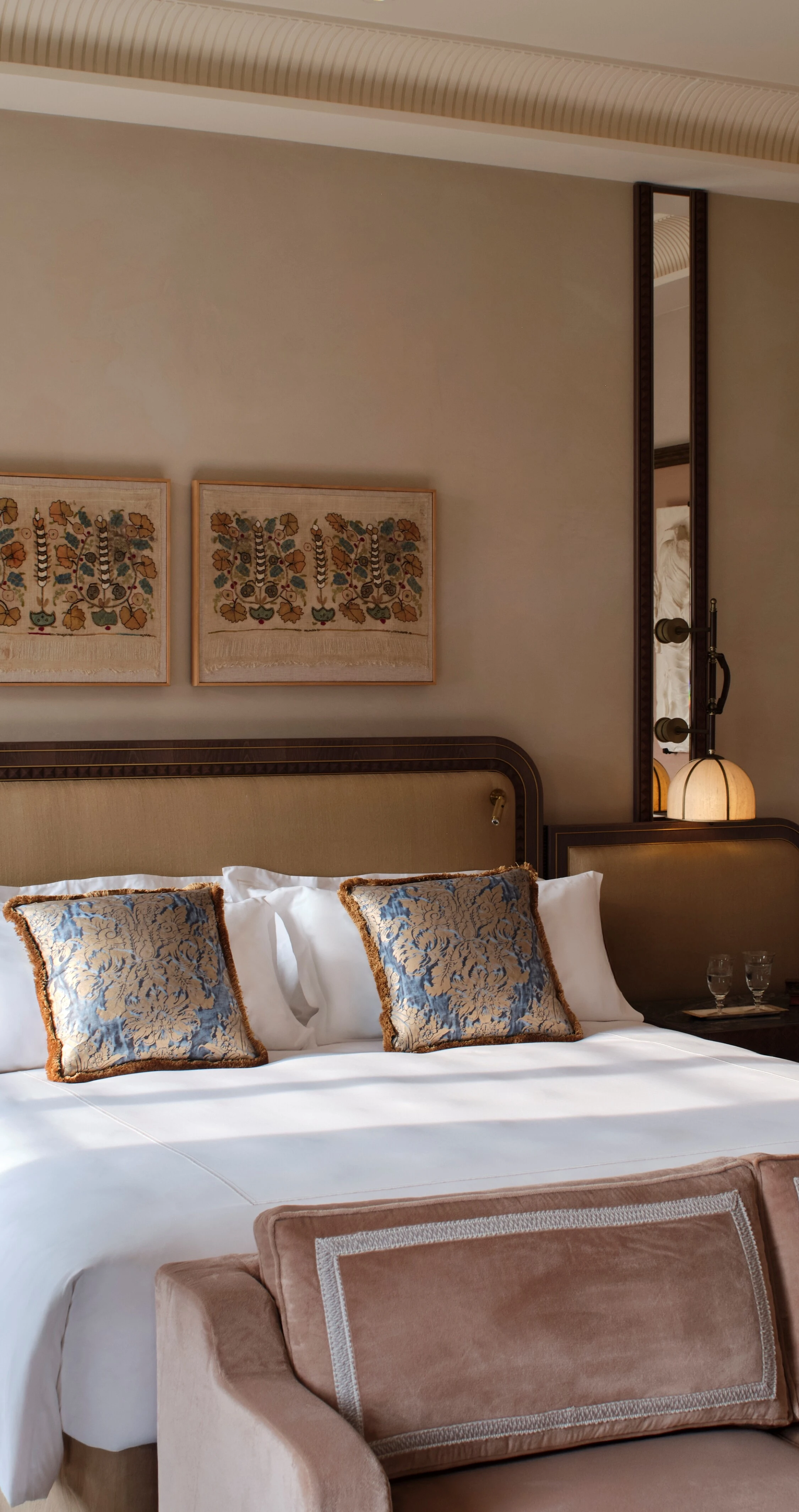 Traces of an illustrious history resurface in vaulted ceilings painted with glorious frescoes and adorned with ornate stuccos that have silently witnessed the passage of centuries. Watered silks cover the walls capturing the canals’ infinite reflexions while sumptuous velvets converse with vibrant marbles evoking the city of the Doges’ rich tapestry of stones. A tribute to the distinctive venetian aesthetics and artistry composed in a symphony of shimmering lights and lost colours.