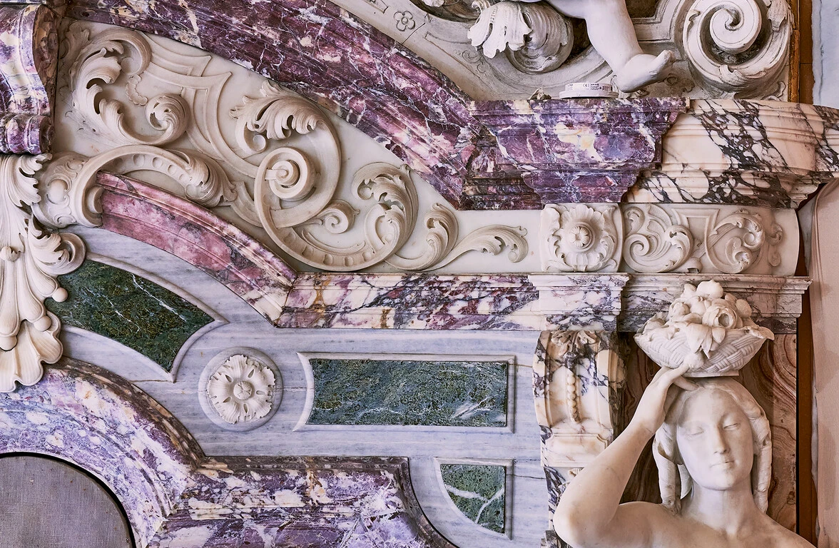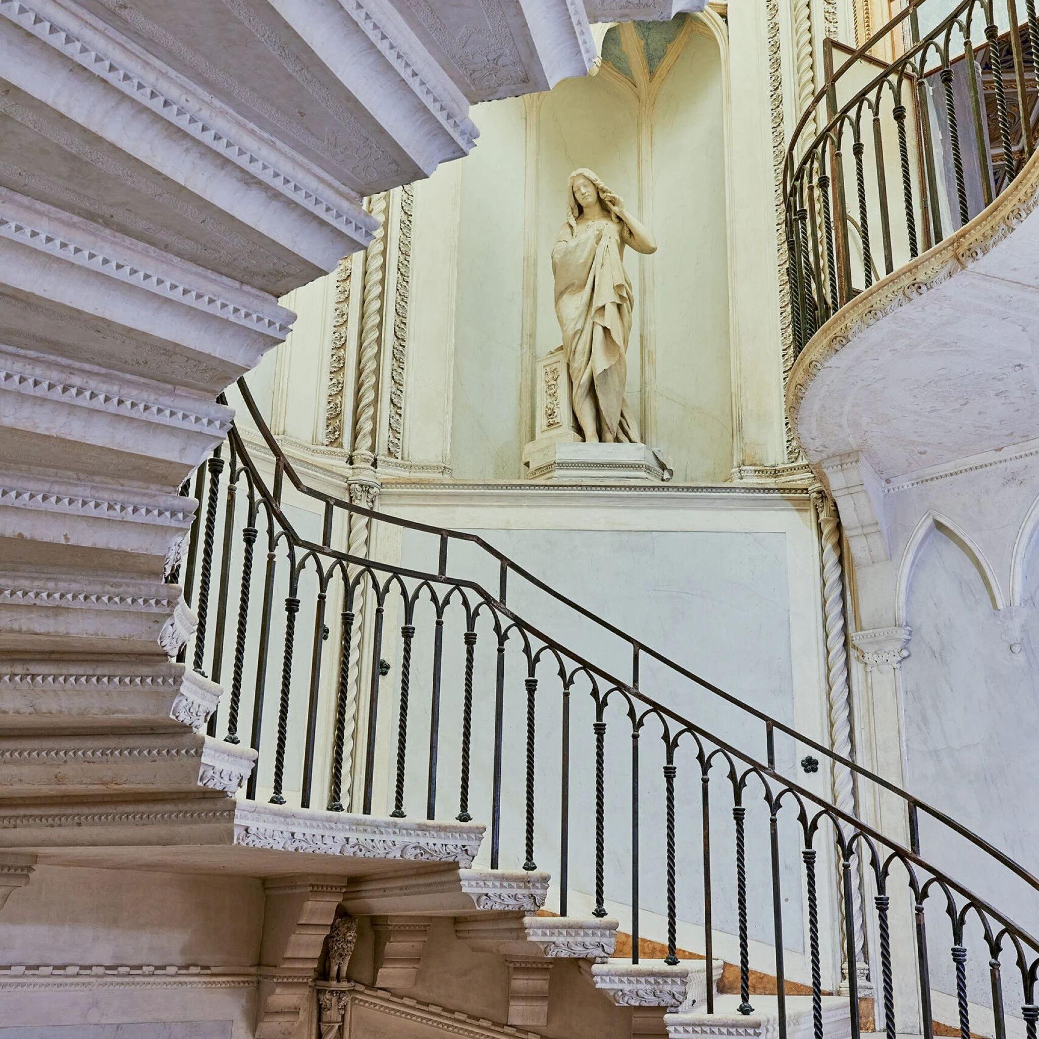 On the main floor, or piano nobile, many salons and ballrooms are home to 800 years of history. It is a journey through the ages, a blend of baroque, neoclassical and gothic styles along with the splendour of Eastern fantasy. The rooms are decorated with patterns, mosaics, stucco, paintings, frescoes tinted with forgotten colours and wonderful cherubs. The walls abound in enigmas never meant to be solved.
