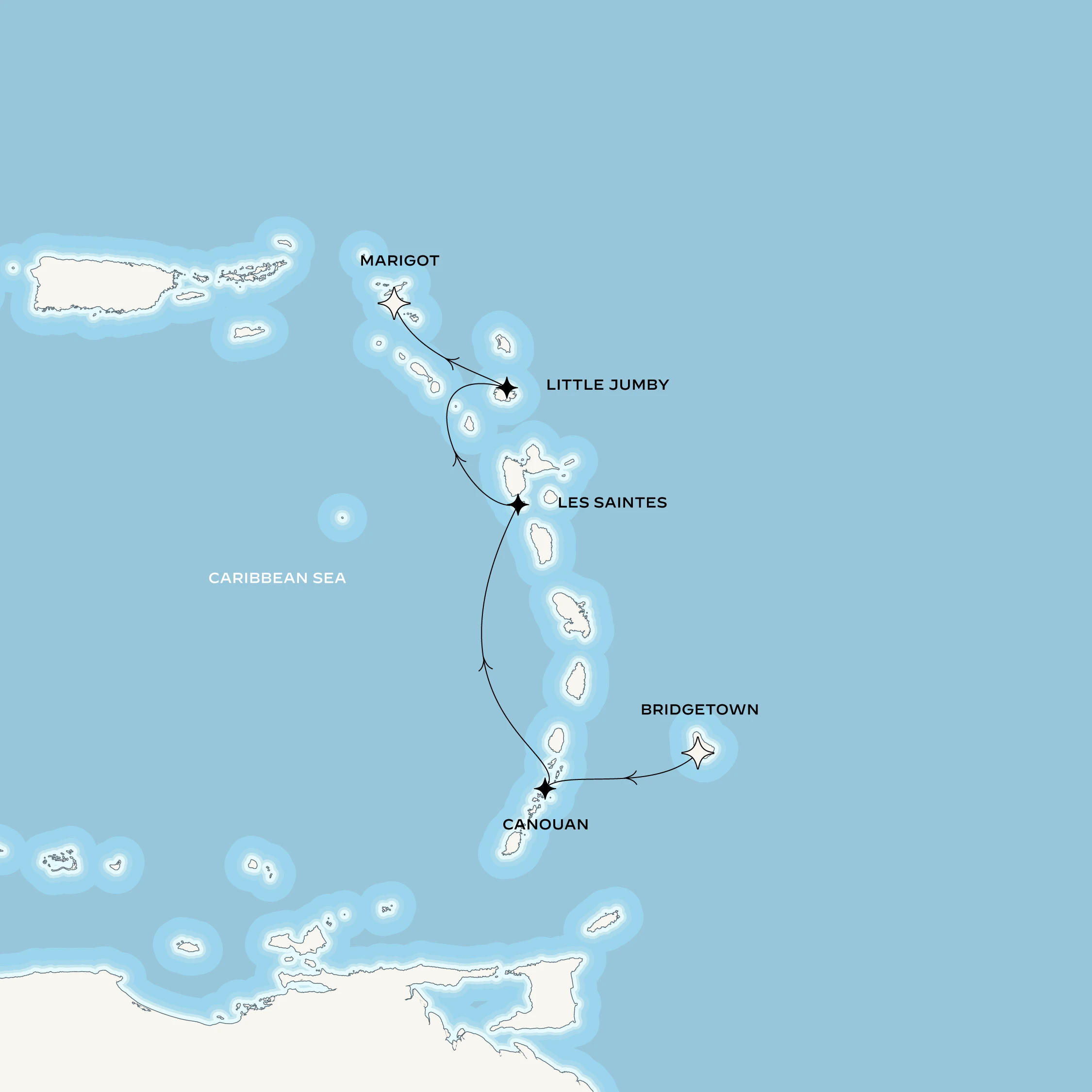Departing from Barbados’ British colonial port of Bridgetown, slip into a gentler rhythm as you arrive in Canouan, a secluded treasure of the Grenadines where time seems to loosen its hold. From there, sail across luminous azure waters toward les Saintes, a pair of enchanting islets just south of Guadeloupe, where a Sugarloaf-like peak rises above pristine forests and untouched coral reefs. That evening, immerse yourself in a candlelit concert at Fort Napoléon, as the hilltop fortress glows gold and the bay unfurls below in all its quiet majesty. After this exceptional interlude, your course leads you to Little Jumby, before guiding you the following day toward Marigot, a Creole stunner on St. Martin. But the dreams you’ve dreamed linger.