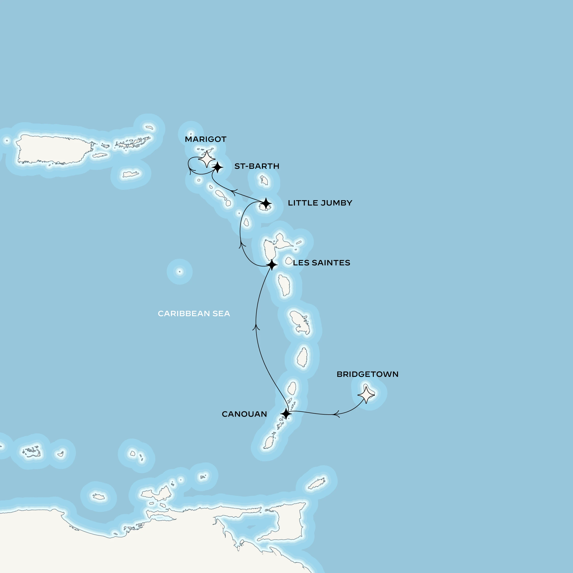 Departing from Barbados’ British colonial port of Bridgetown, slip into a gentler rhythm as you arrive in Canouan, a secluded treasure of the Grenadines where time seems to loosen its hold. From there, sail across luminous azure waters toward les Saintes, a pair of enchanting islets just south of Guadeloupe, where a Sugarloaf-like peak rises above pristine forests and untouched coral reefs. That evening, immerse yourself in a candlelit concert at Fort Napoléon, as the hilltop fortress glows gold and the bay unfurls below in all its quiet majesty. After this exceptional interlude, your course leads you to Little Jumby, before guiding you to the iconic St. Barth, where chic beach clubs, discreet designer boutiques and legendary shorelines create a destination beloved by the world’s most seasoned travelers. The voyage conclude in the harbour town of Marigot, your final exhale after a rarefied escape.
