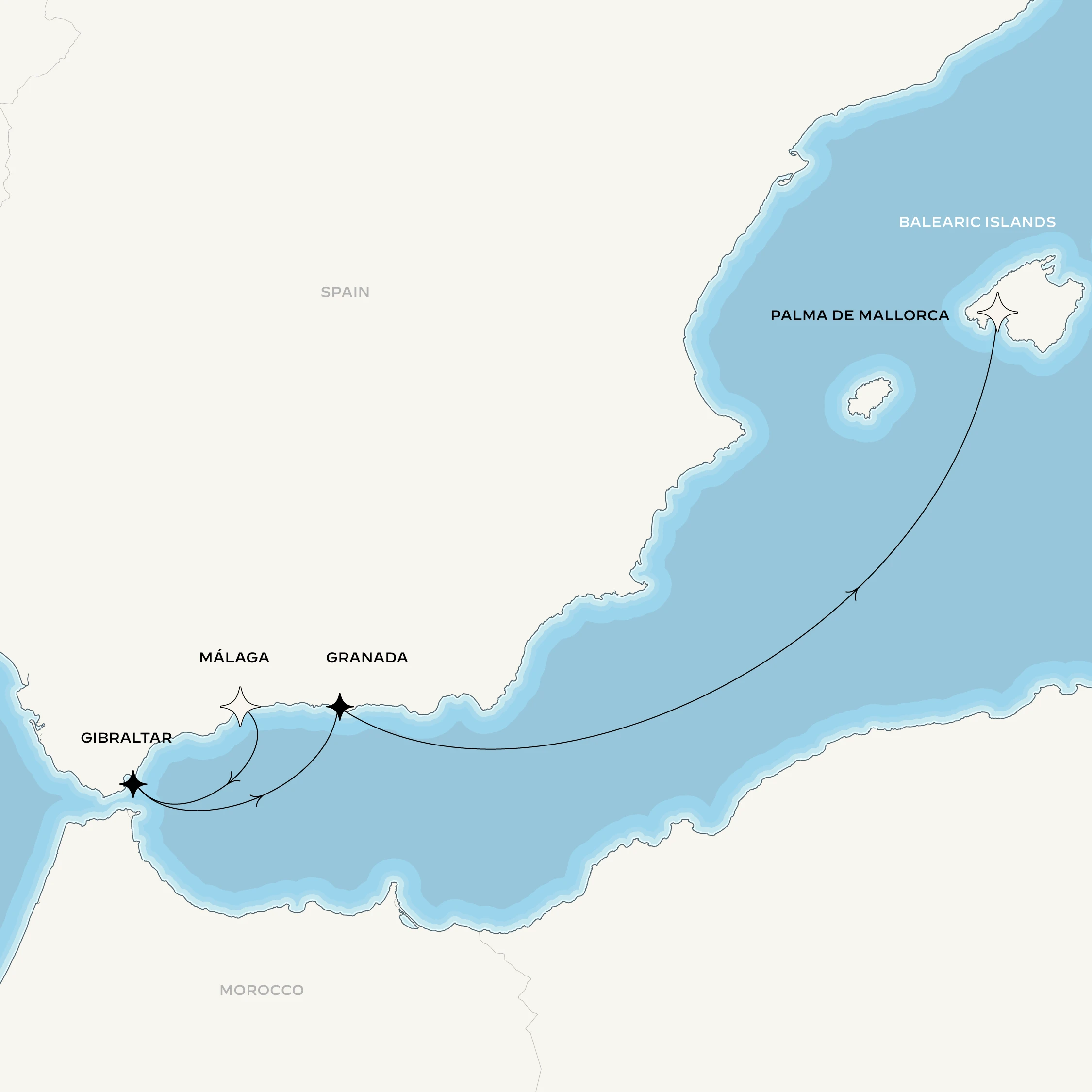 Sail into Andalusia’s sun-drenched seduction, where golden strolls inspired the genius of Picasso and lively tapas bars stimulated poets pondering Federico Lorca. From Málaga, the journey glides to Gibraltar’s towering Rock, summiting for panoramic views that span two continents and inviting contemplation of how Hercules split apart the land. Anchor in Motril, the cool city of the Costa Tropical, which leads to Granada and the peerless Alhambra, where an exclusive sunset celebration unfolds, admiring the “Red Fortress” as its walls glow, savoring a moment that can never be duplicated. The voyage crescendos in Palma, where turquoise bay and palm-lined boulevards captivate the senses.
