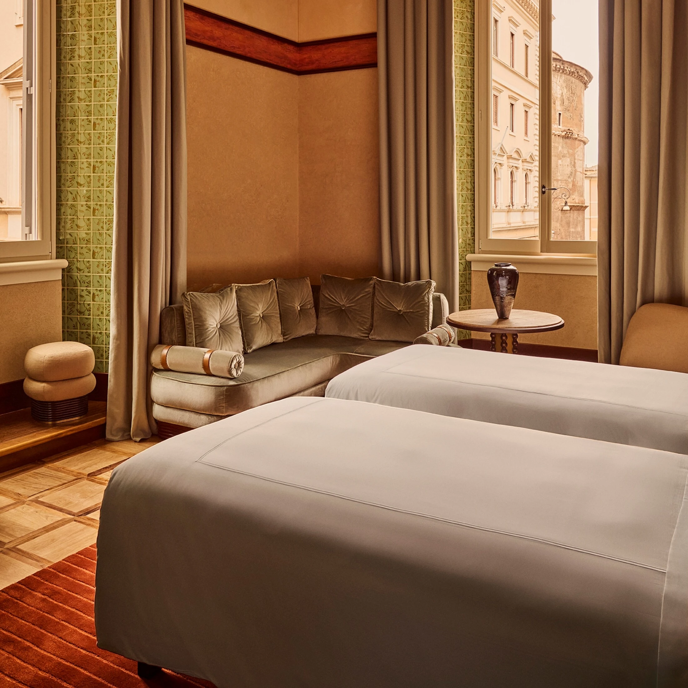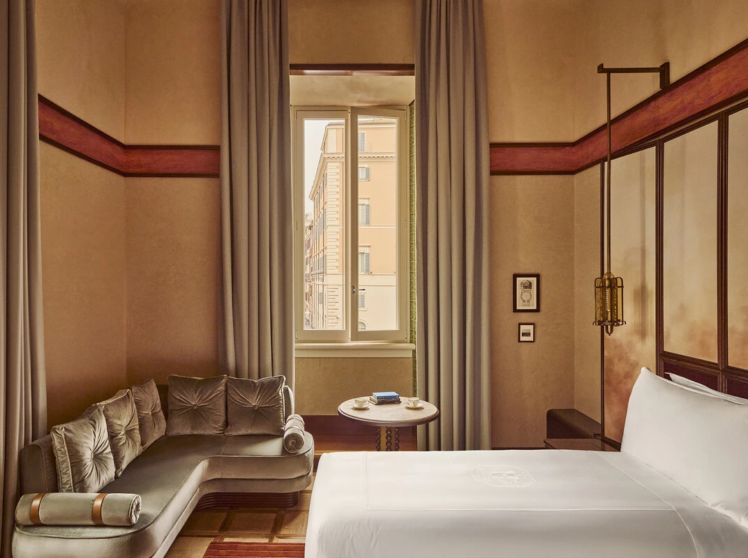 Cette somptueuse suite rend hommage à l’histoire de l’Orient Express. Surplombant le Panthéon et la Place de la Minerve, elle met à votre disposition un superbe espace de vie/salle à manger, une coiffeuse et un cabinet de toilette. Magnifique salle de bains avec double vasque, douche à l’italienne et baignoire.