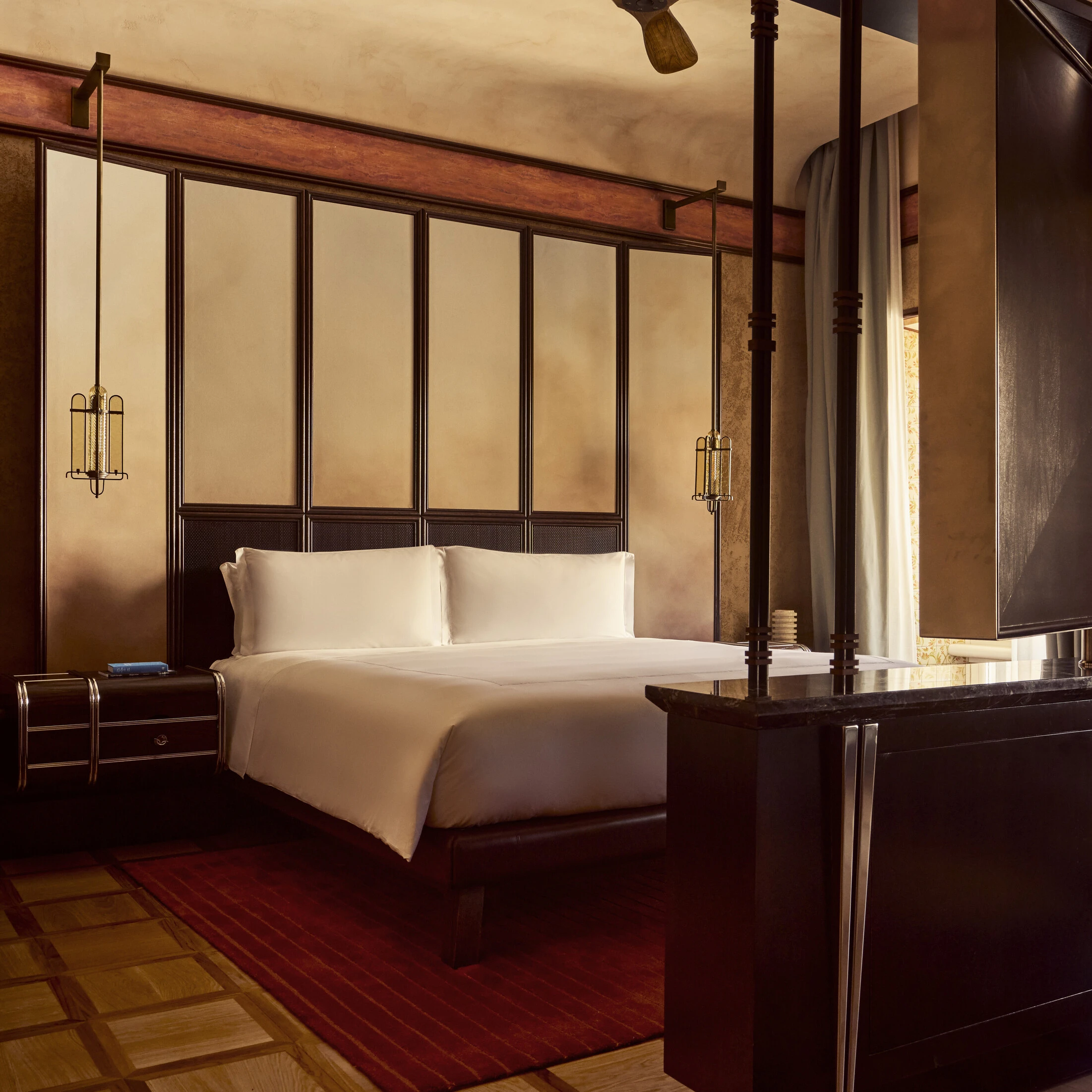Suites junior spacieuses avec lits jumeaux ou lit king size et coiffeuse. Style Art déco, parquet. Salle de bains en marbre avec vasque simple en forme de coquillage ou double vasque et douche à l’italienne ou baignoire. Linge haut de gamme, articles de toilette exclusifs, minibar avec boissons sans alcool gratuites, assortiment de cafés et de thés.