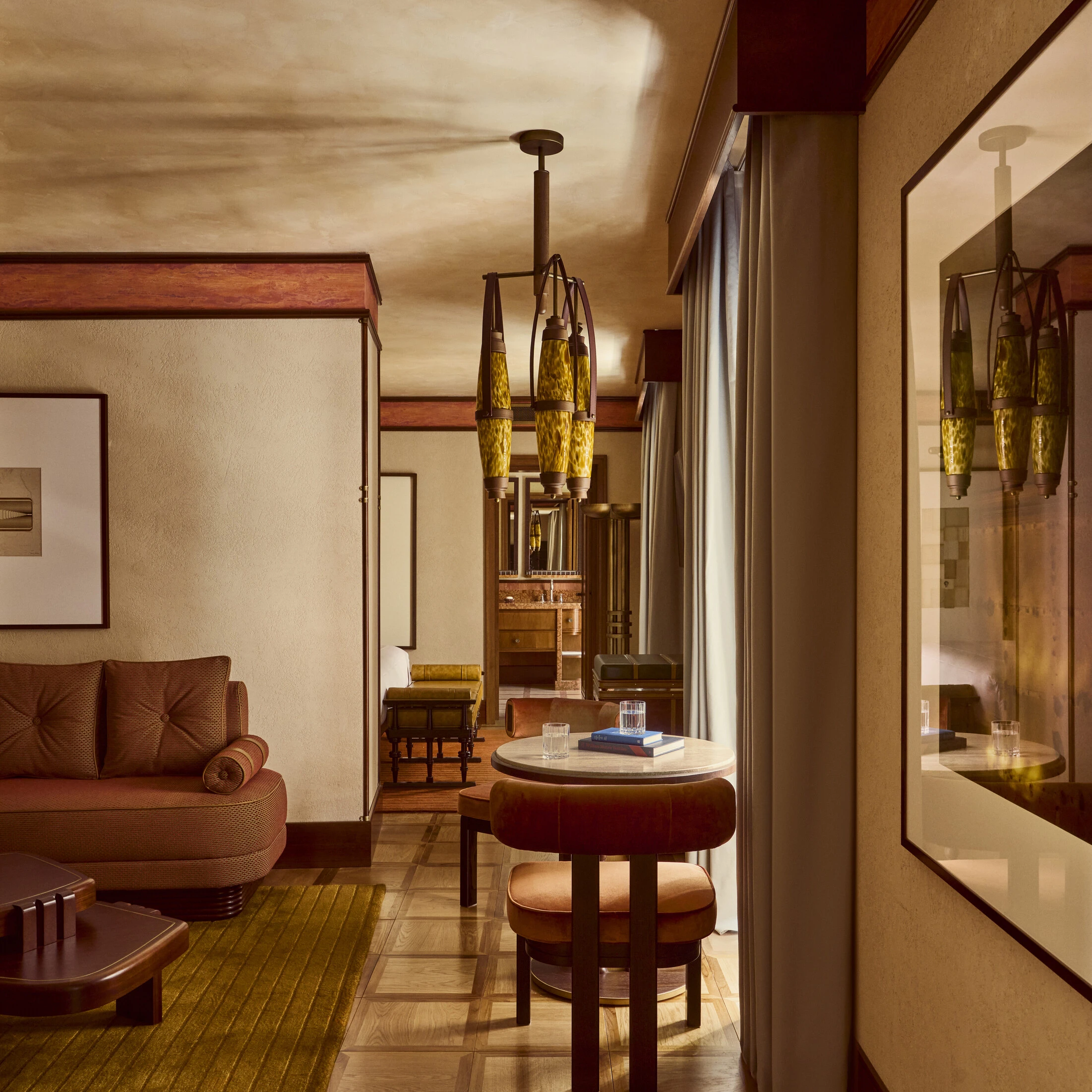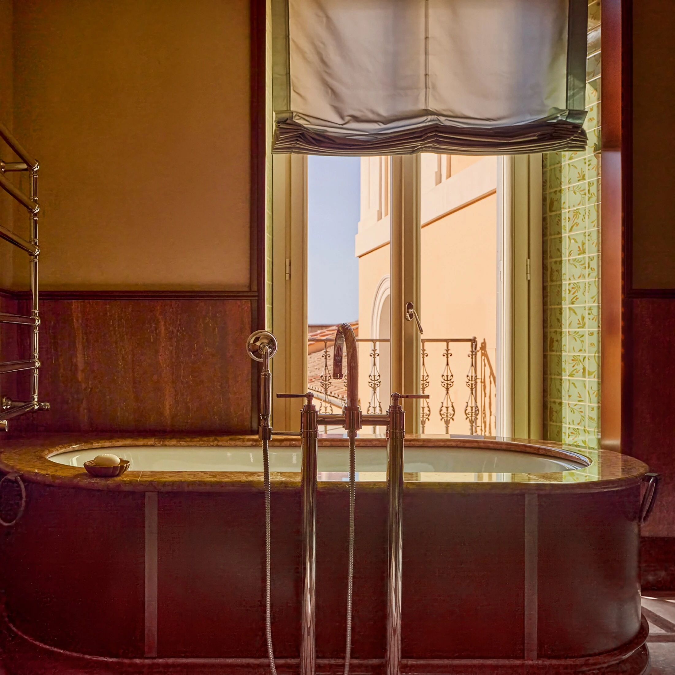 Suites junior avec lits jumeaux ou king size et charmante terrasse privée. Style Art déco, parquet, salle de bains en marbre avec vasque simple en forme de coquillage ou double vasque et douche à l’italienne