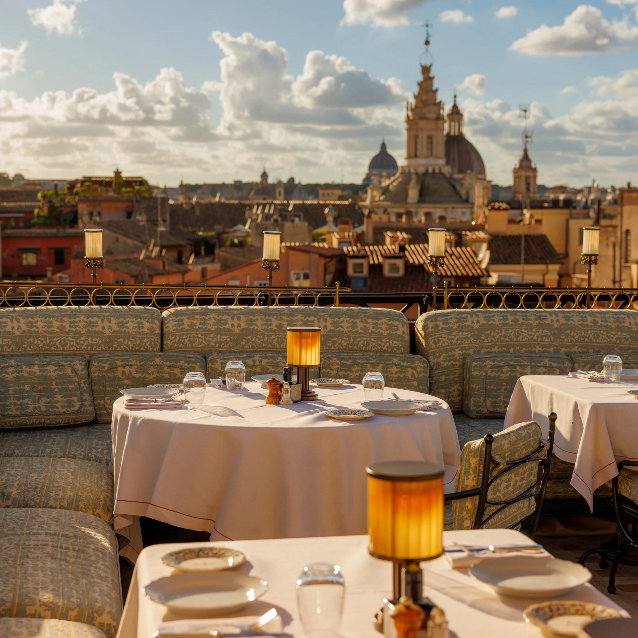 La terrasse s’étend dans des proportions généreuses : les tables extérieures sont baignées de ciel et toutes bénéficient d’une vue spectaculaire. Certaines, stratégiquement positionnées, promettent un moment d’un romantisme absolu. La salle intérieure possède elle aussi de larges ouvertures sur ville. Oui, Gigi Rigolatto Rome offre une vue totale, panoramique, à 360°, mais aussi un regard sur Rome, dans toute sa dramaturgie historique et lumineuse.