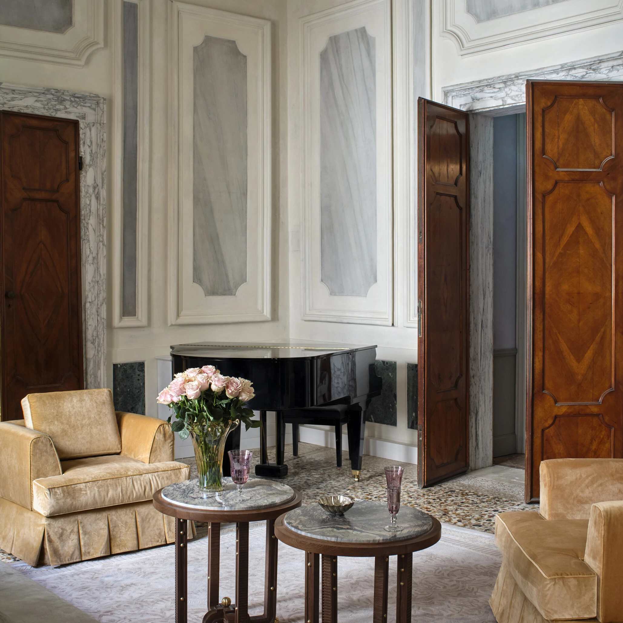 Située sur le Piano Nobile (l’étage Noble), la Sala della Musica évoque les salons aristocratiques où familles et invités se réunissaient en fin de journée. Le plafond, orné de motifs floraux, constitue un élément central du décor. Au cœur de la pièce, un piano à queue structure l’espace, tandis que des cabinets à boissons sont disposés le long des murs. Pensée pour des formats intimistes, la salle accueille aujourd’hui dîners privés, cocktails, lectures ou performances musicales, dans une continuité d’usage fidèle à son esprit d’origine.