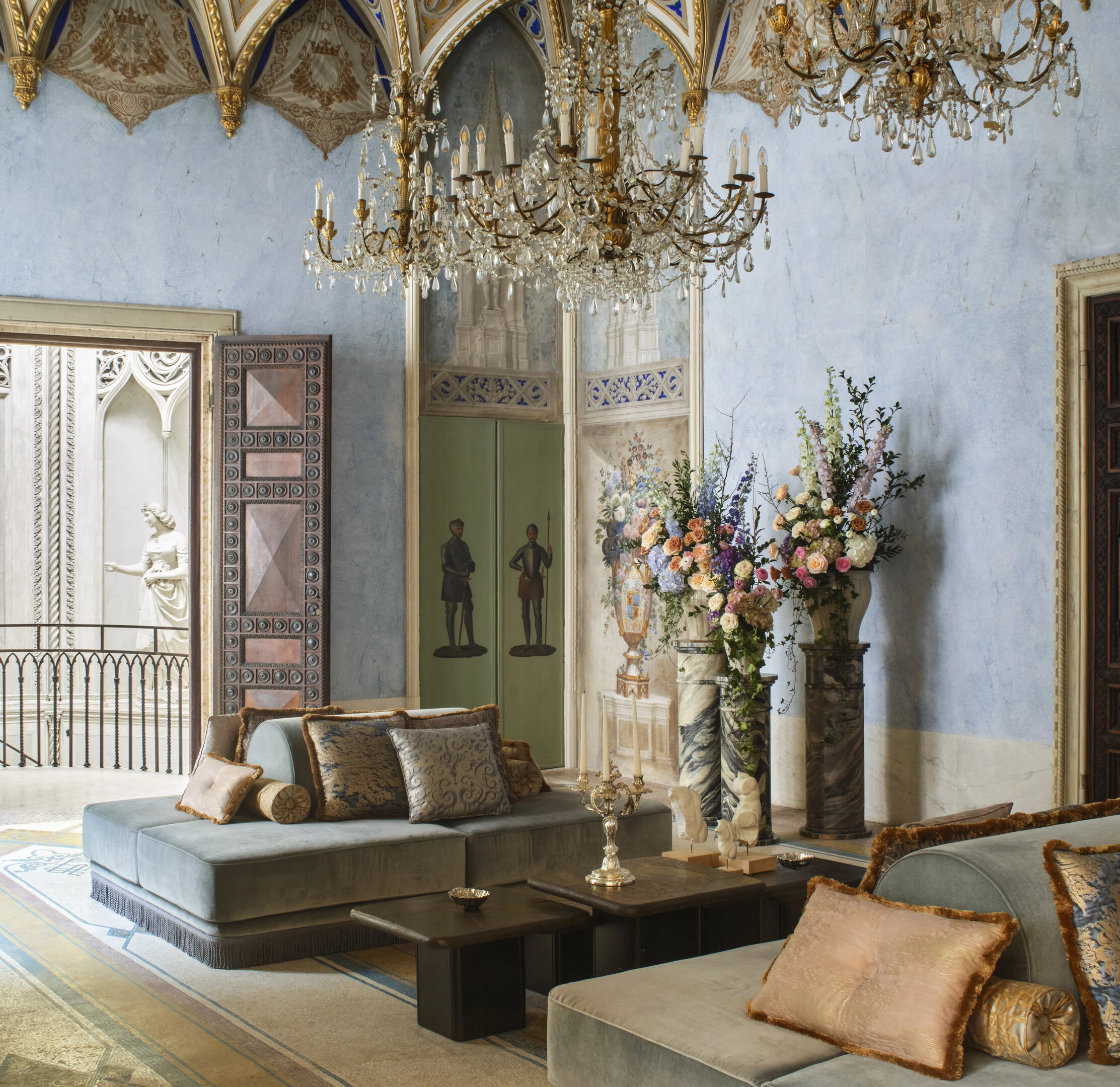 La Sala della Cultura s’inscrit dans l’histoire du Palazzo comme le lieu de rencontre des esprits raffinés. Au XIXe siècle, le Palazzo accueille notamment des rassemblements tels que le Congrès des scientifiques italiens en 1847. Restauré dans le respect de ses éléments d’origine, l’espace conserve cette fonction de transmission et de dialogue. Il est aujourd’hui utilisé pour des rencontres, conférences ou événements culturels, qui se déroulent sous son plafond de style néo-gothique déployant un ciel lapis-lazuli traversé de cordons dorés. Les quatre grandes compositions florales, attribuées à Giuseppe Voltan, font écho aux jardins du Palazzo.