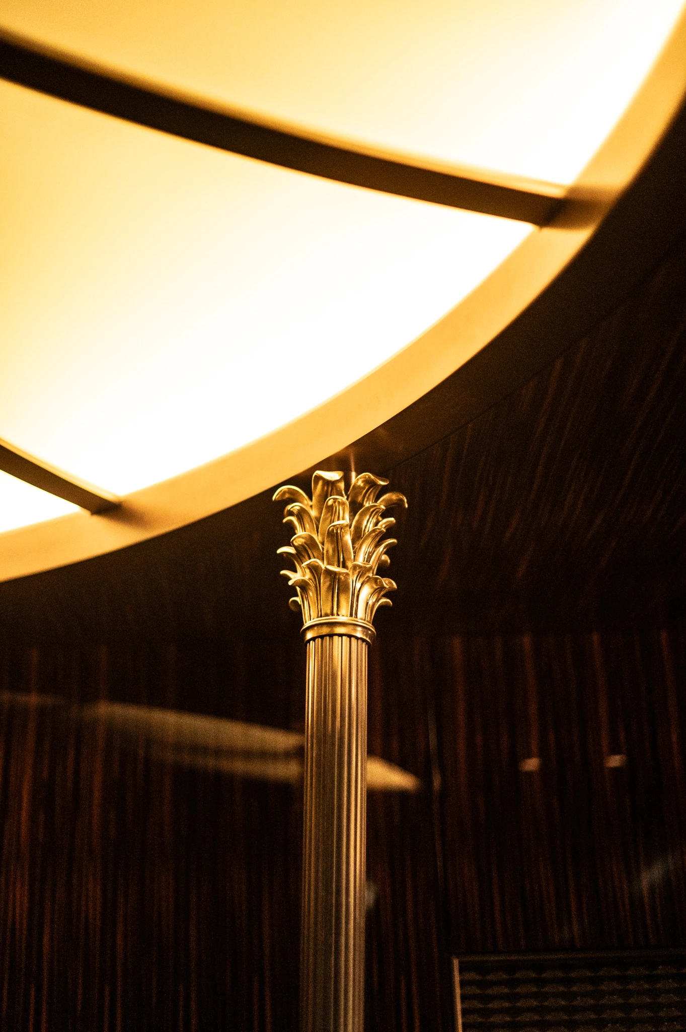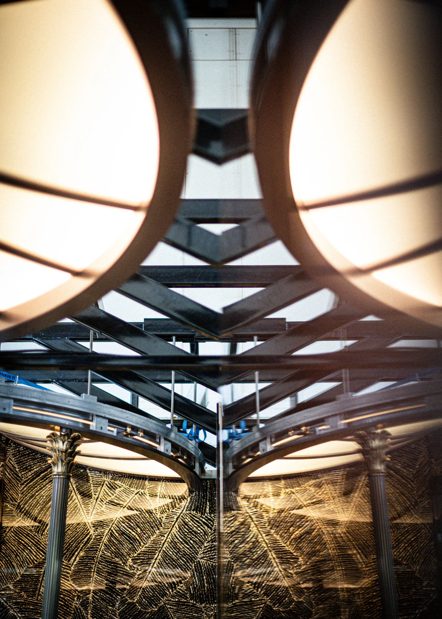 Le plafond miroité évoque les verrières monumentales des gares européennes du XIXe siècle. Ces structures métalliques sont ici réinterprétées en arcatures coffrées de bois laqué, conciliant rigueur architecturale et chaleur du décor.