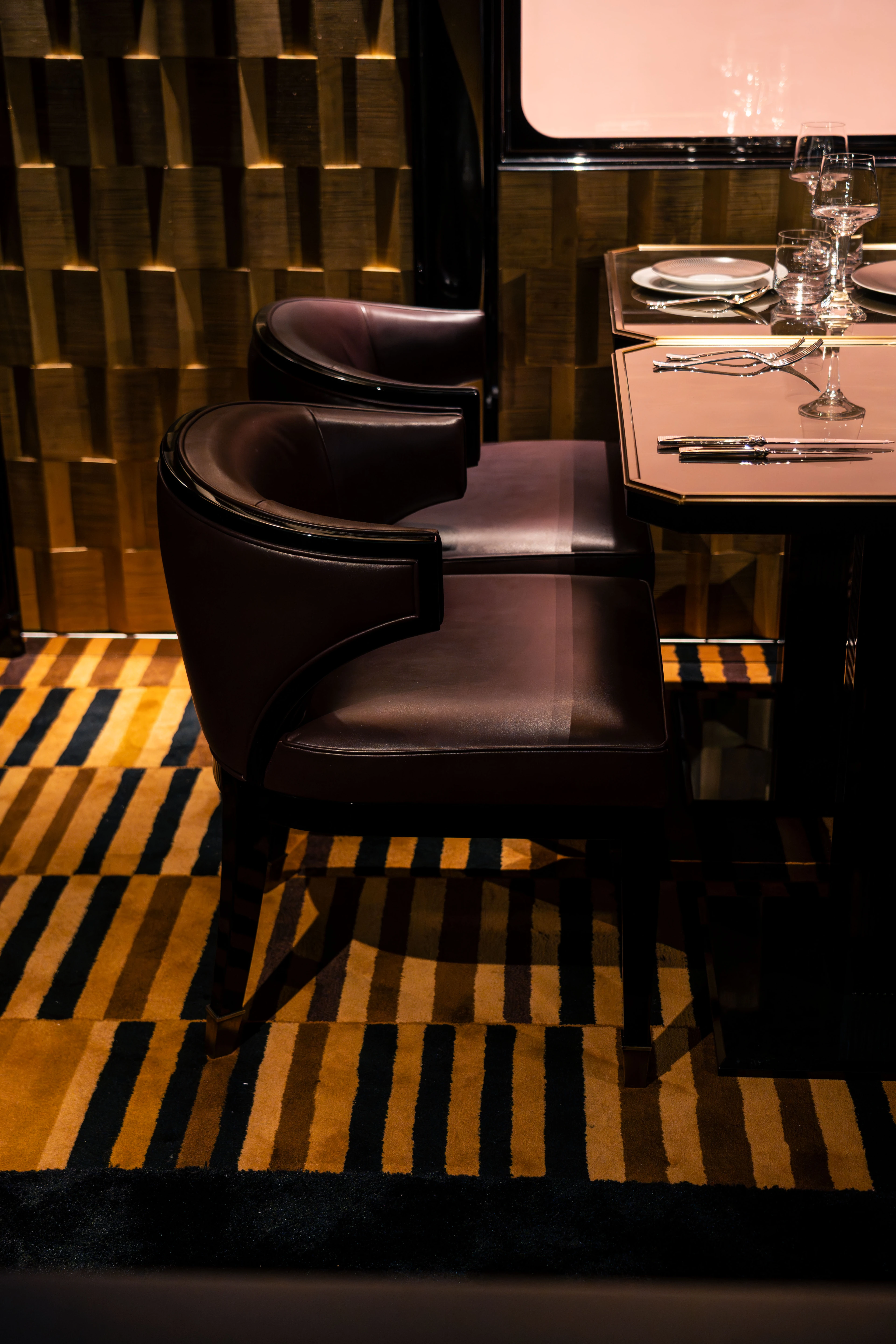 Aux murs, une marqueterie contemporaine aux reflets chauds prolonge le jeu de lumière et de matière, le dialogue entre mémoire et modernité. À l’extrémité de la salle, la cuisine ouverte, visible à travers une paroi de verre ondulant, réinvente la transparence des anciennes voitures-restaurants.