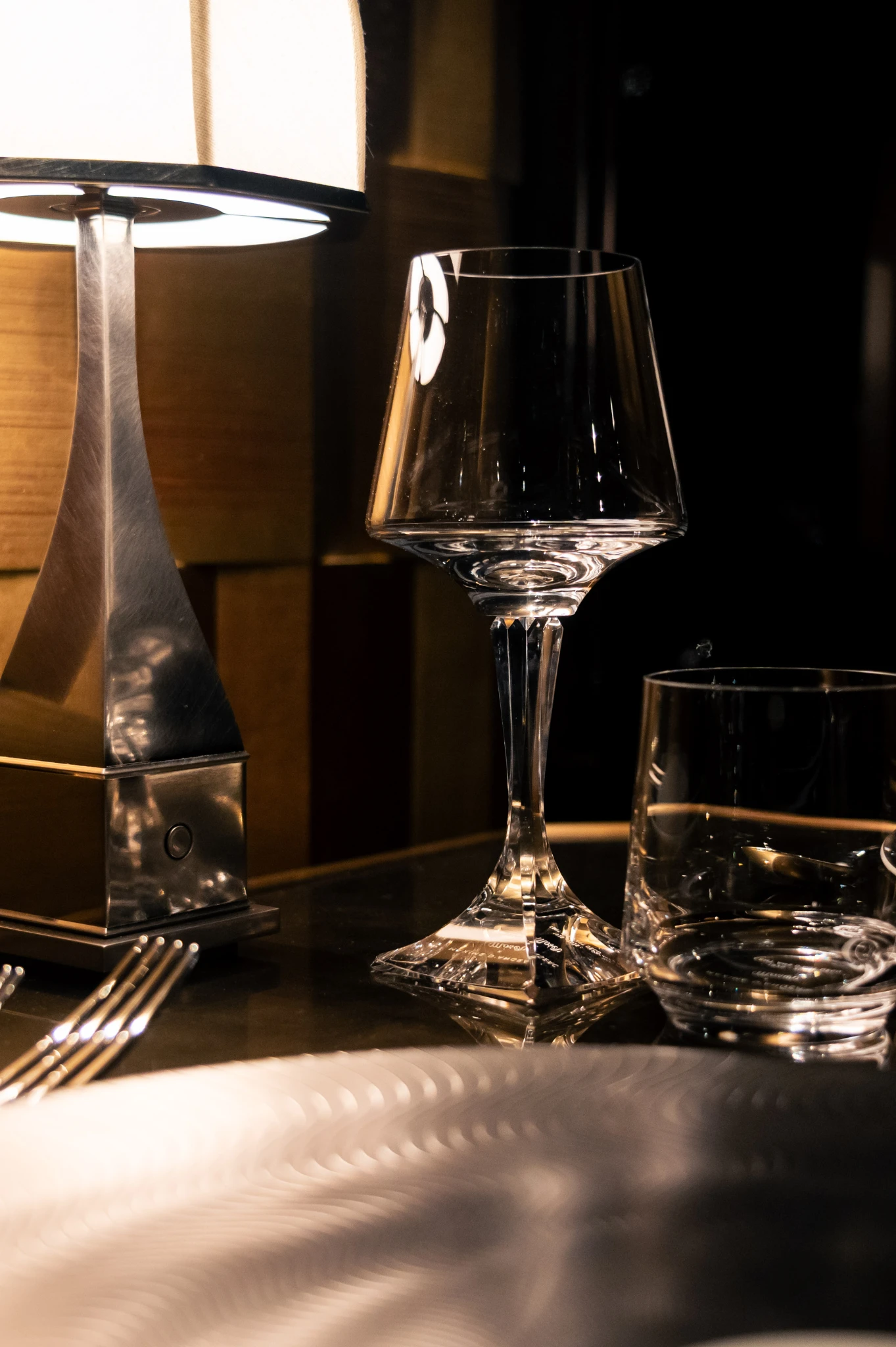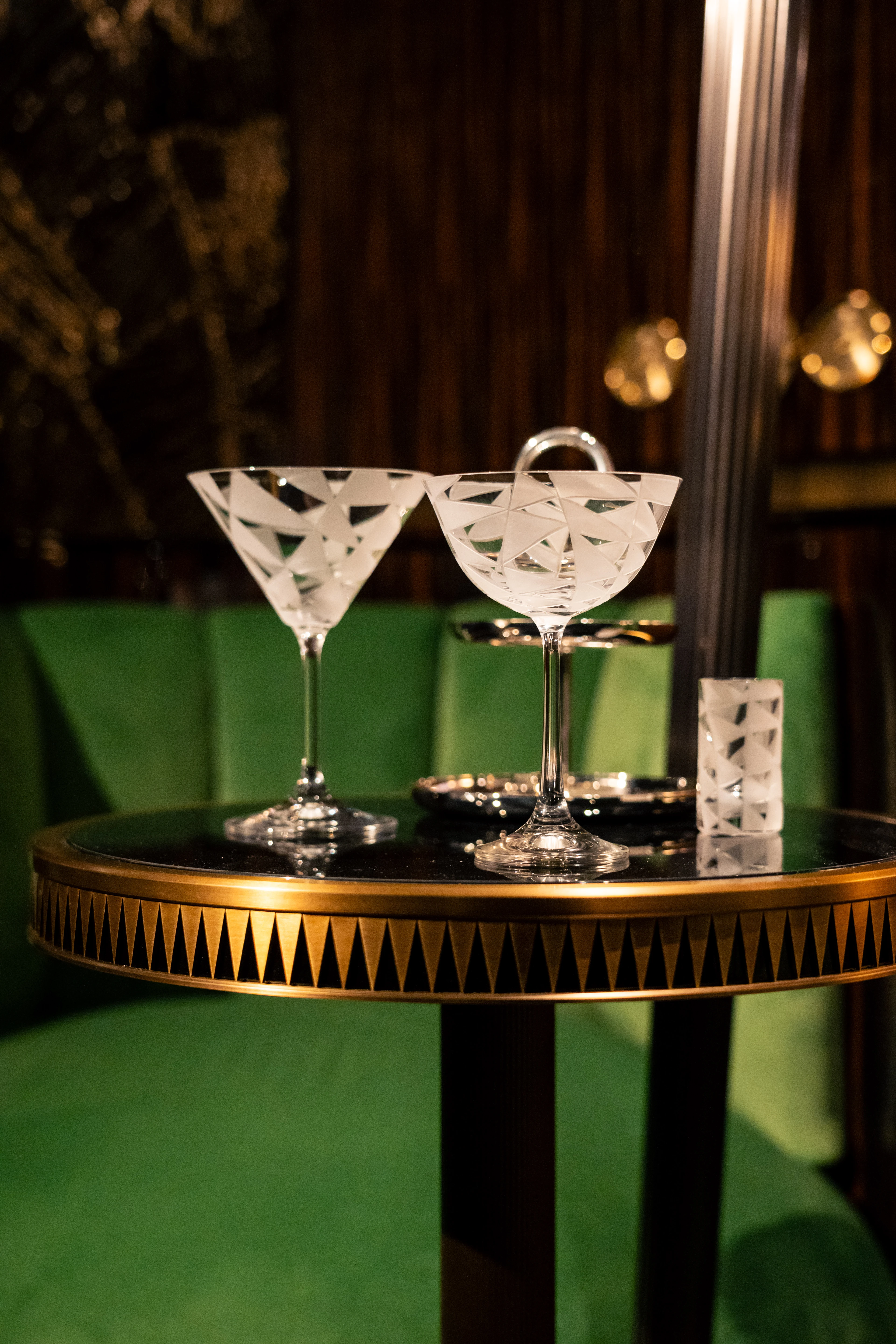 Les boiseries en palissandre et les chapiteaux à la patine dorée instaurent un dialogue entre la chaleur du bois et l’éclat du métal. Pièce centrale, le bar flûté de verre s’inspire du travail de René Lalique, dont il reprend la transparence et le jeu de reflets.