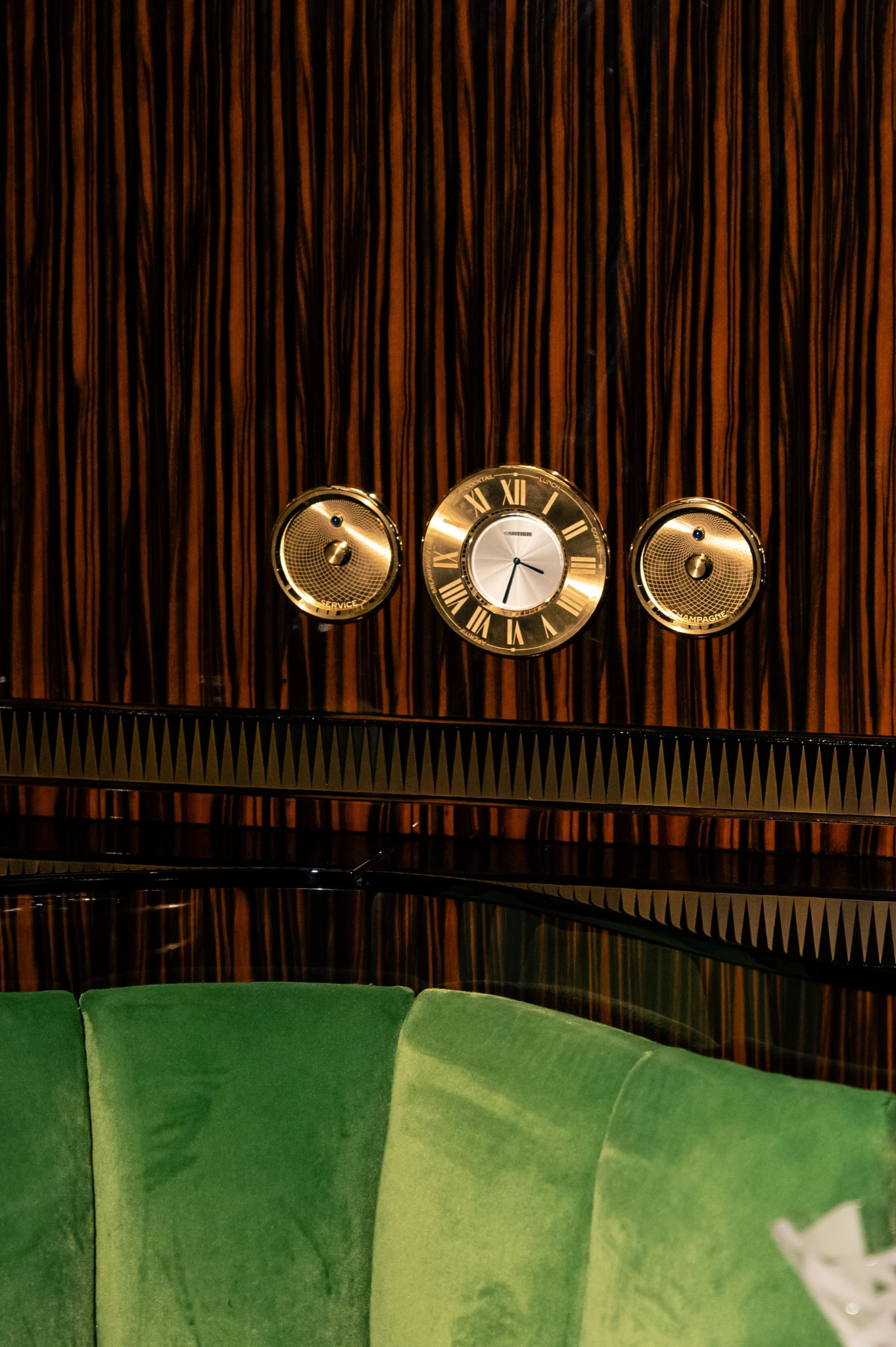 L’attention portée à la circulation, à la fluidité des lignes et à l’équilibre des volumes traduit une volonté de rigueur et d’élégance. Certains détails, comme la pendule murale, les boutons d’appel pour le service et le champagne, évoquent l’esprit hédoniste et raffiné des grands voyages.