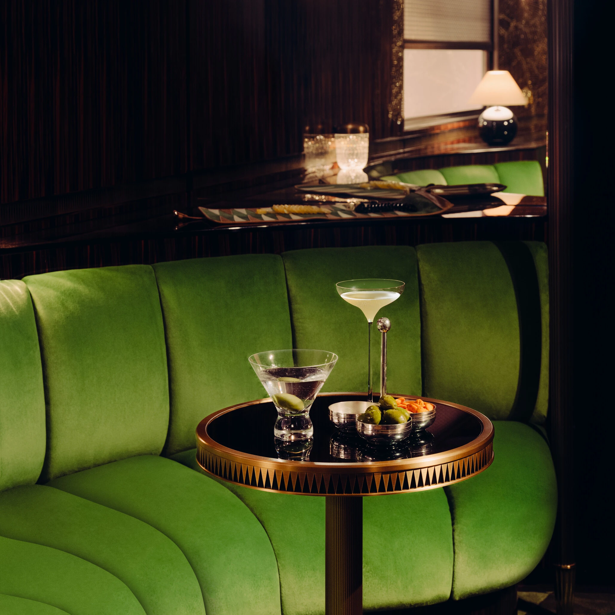 Sous ses coupoles en verre sablé, l’espace repense deux grands courants décoratifs : le Second Empire et l’Art nouveau. L’aménagement évoque le faste des salons du XIXe siècle, réinterprété avec un sens contemporain de la composition et de la lumière. Les colonnes élancées organisent la perspective, tandis que les banquettes en velours côtelé, d’un vert vibrant, structurent l’assise et animent l’ensemble.
