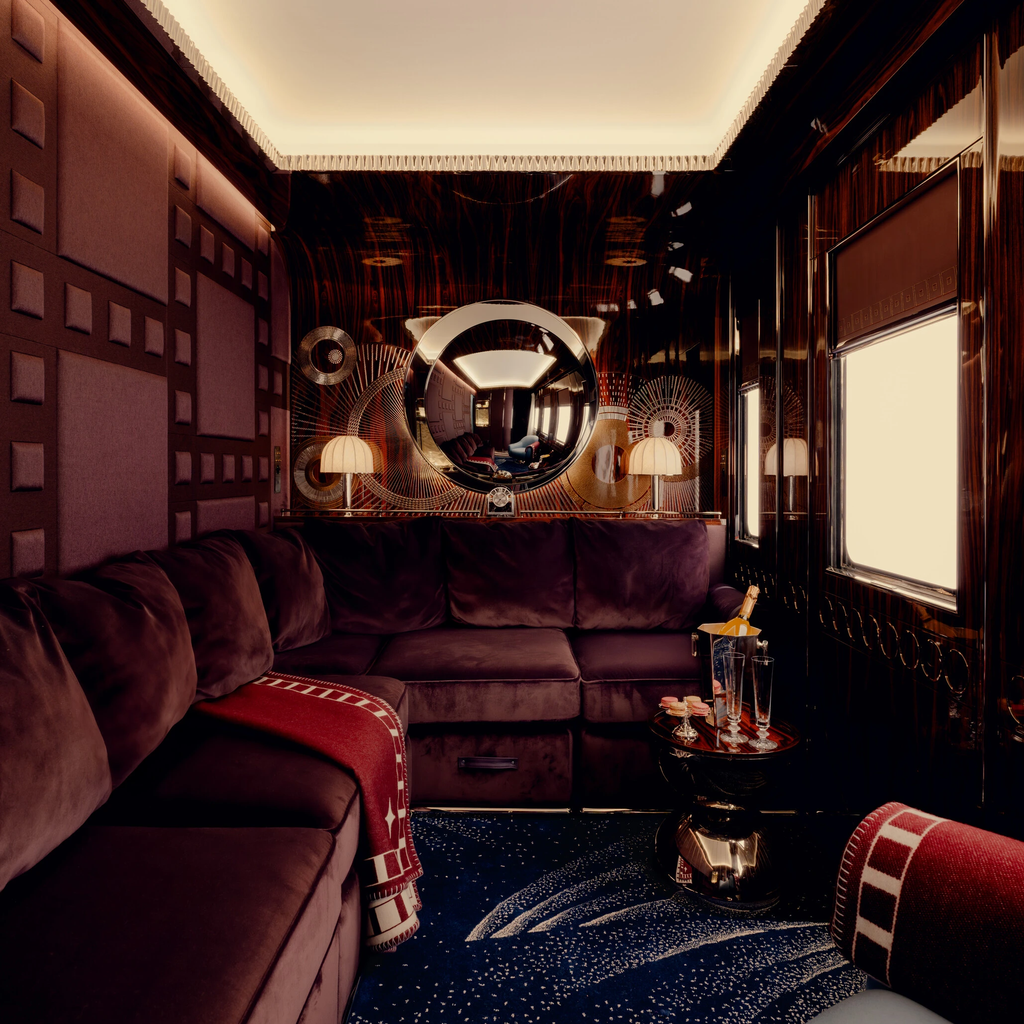 Les boiseries précieuses encadrent les fenêtres et prolongent la ligne du paysage en mouvement. Les murs gainés, inspirés du motif Rail de Suzanne Lalique-Haviland, rappellent la filiation historique. Les têtes de lit en palissandre verni, brodées à la main de perles de nacre et de bronze, traduisent la virtuosité du savoir-faire français.