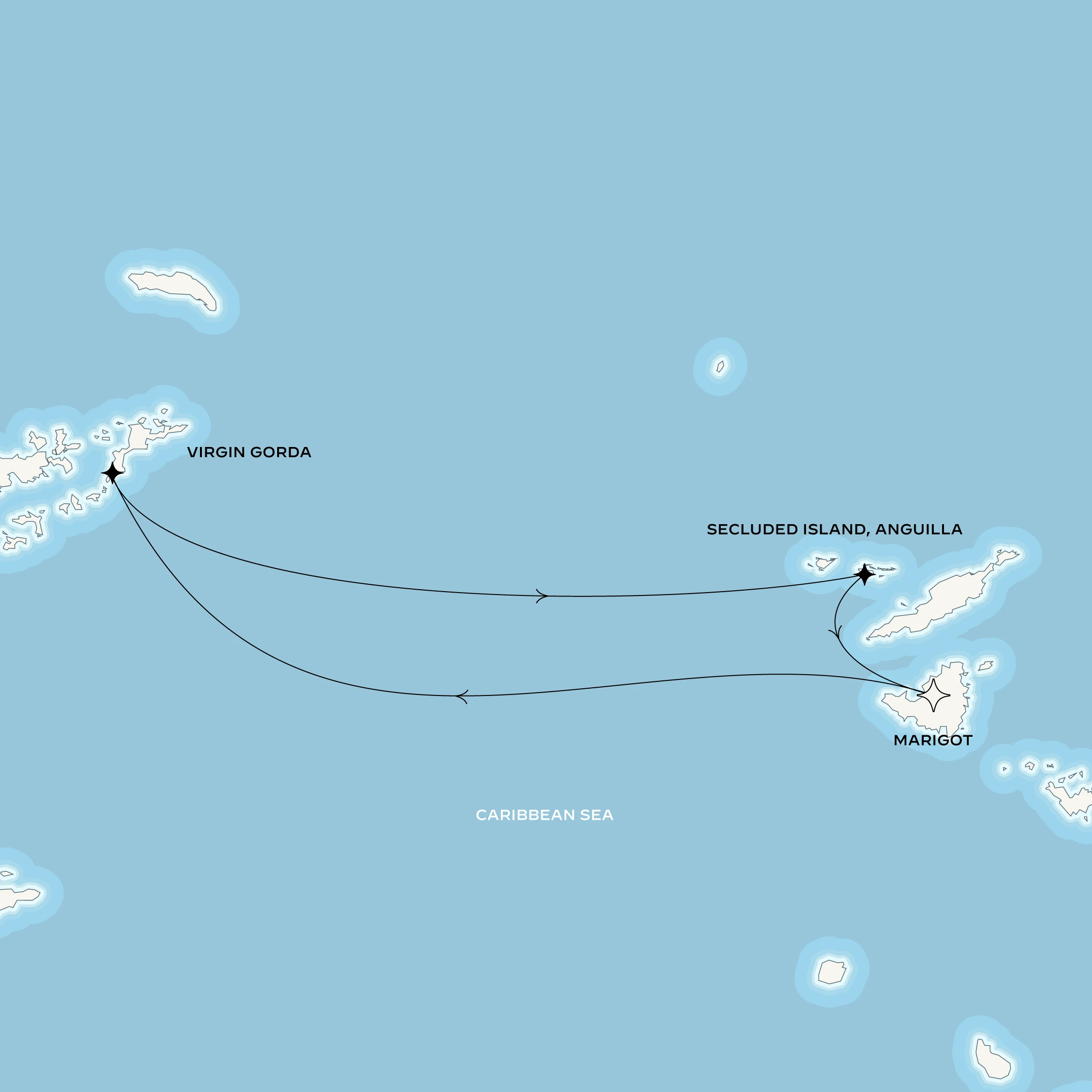 Au départ de Marigot, une première escale vous mènera à Virgin Gorda, qui doit à ses Baths son exceptionnelle beauté. Une spectaculaire formation géologique composée d'énormes blocs de granit forme en effet des grottes, des piscines naturelles et des tunnels au bord de la mer. De là, vous rejoindrez une île isolée d'Anguilla, qui deviendra alors le décor d’une parenthèse imaginée pour vous : farniente caribéen, langoustes grillées et rhum vieux, eaux translucides et rituels bien-être pour une journée véritablement hors du temps. Enfin, votre voyage s’achèvera dans la douceur créole de Marigot.