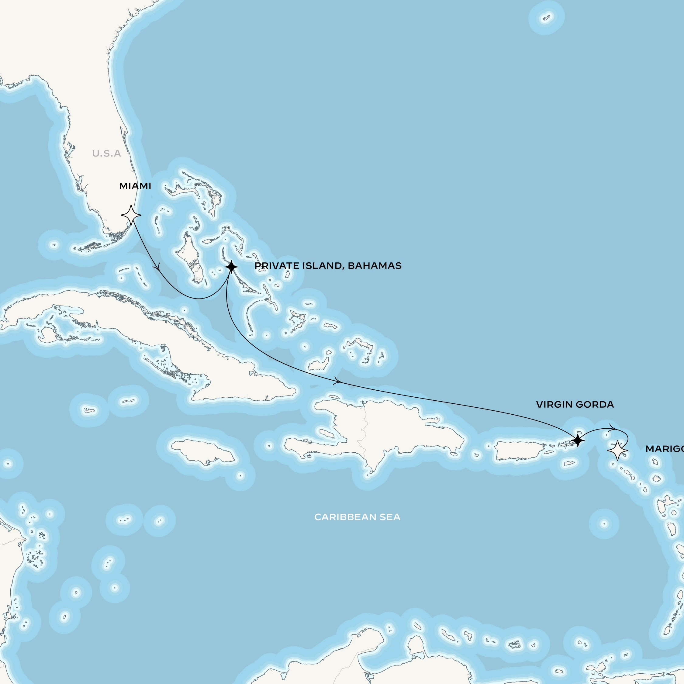 Depuis Miami, le voyage met le cap vers les Bahamas. Dans les Exumas, l’une des îles les plus privées de cet archipel dévoile ses plages de sable immaculé et ses eaux d’un bleu éclatant, cadre idéal pour une parenthèse exclusive hors du temps. Deux journées de navigation invitent ensuite à savourer pleinement l’art de vivre à bord de l’Orient Express Corinthian. La traversée se poursuit vers les Îles Vierges britanniques et Virgin Gorda, célèbre pour les Baths, où d’impressionnants blocs de granit dessinent grottes, piscines naturelles et passages baignés de lumière. À l’arrivée à Marigot, le voyage apparaît comme une succession de paysages et d’instants précieux au cœur des Caraïbes.