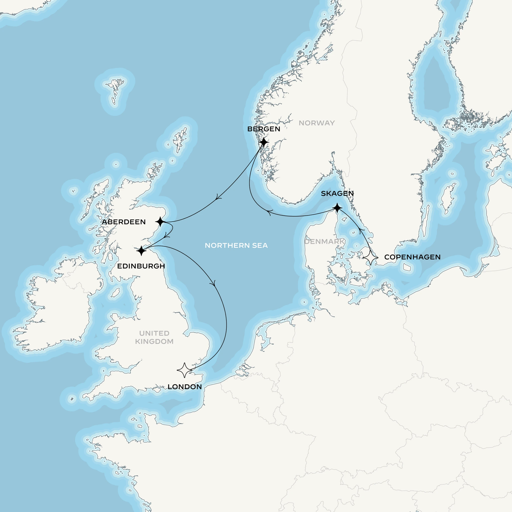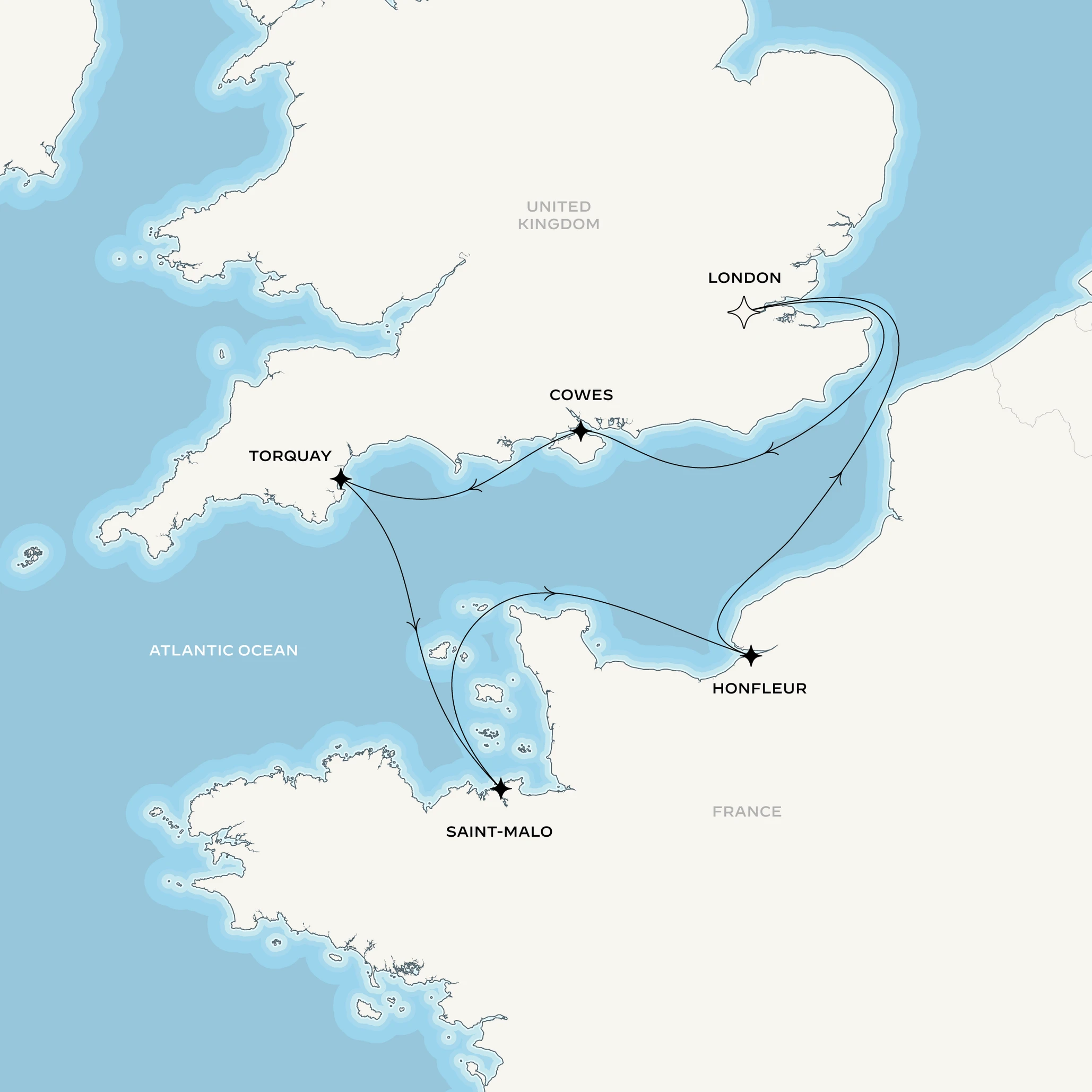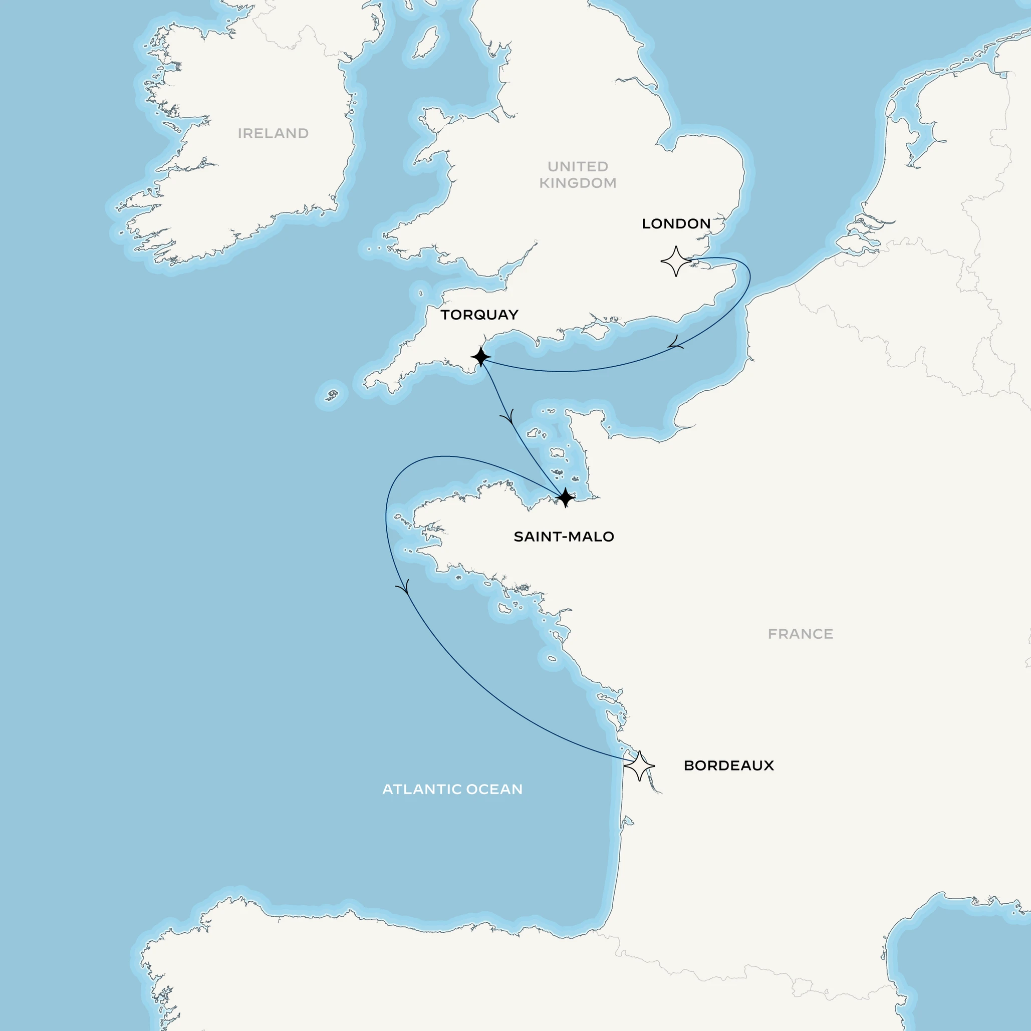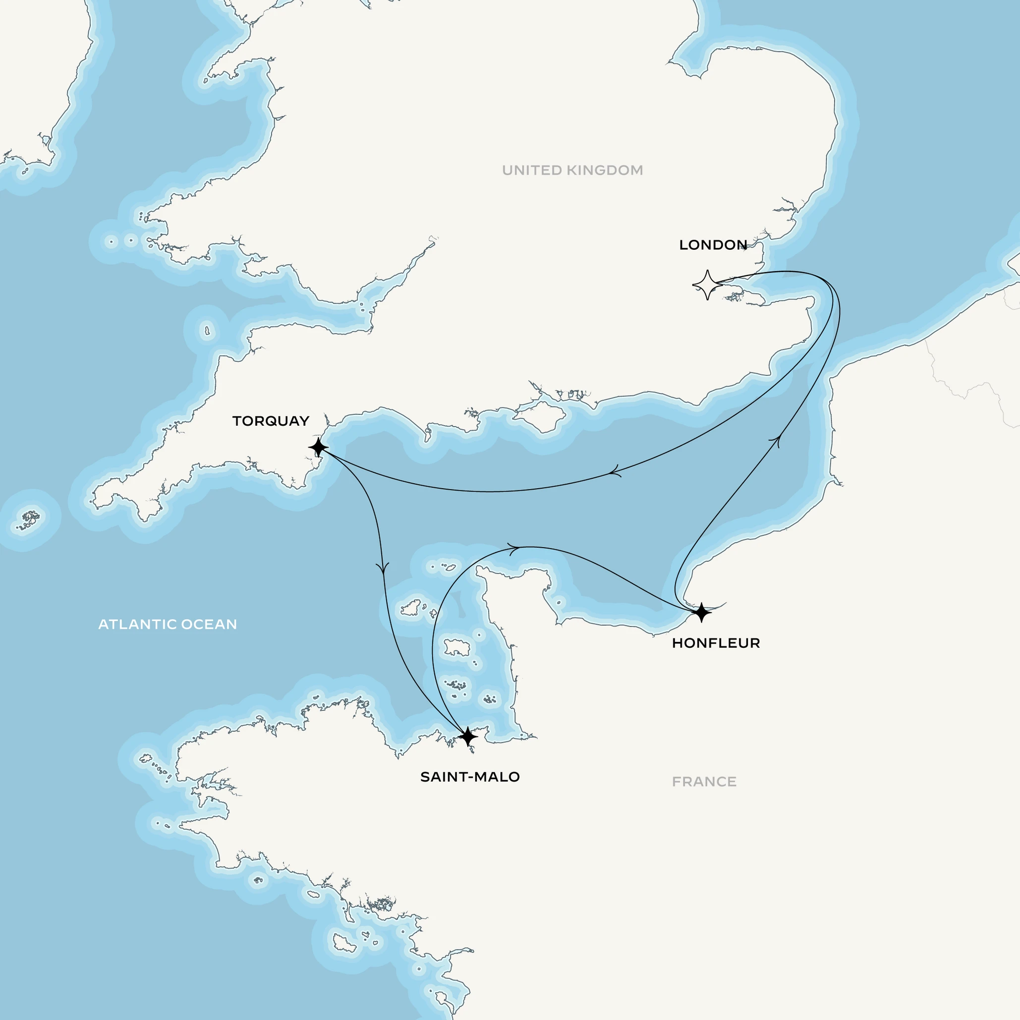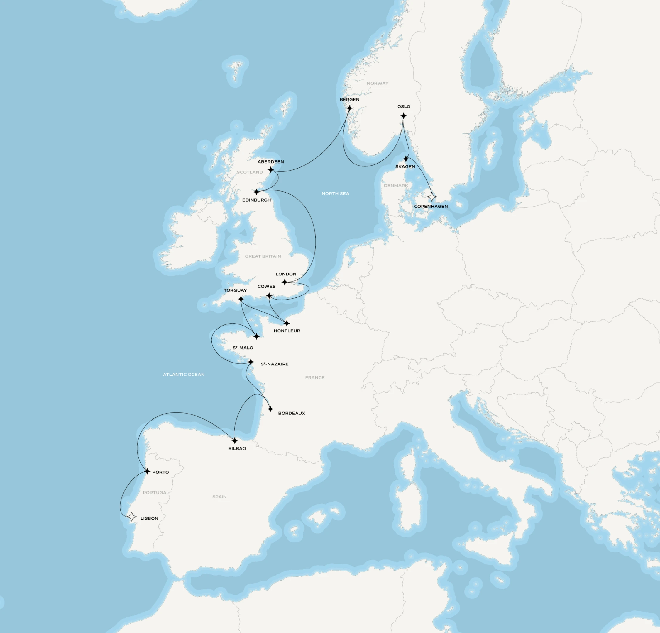 C’est l’Atlantique qui, au cœur de Bordeaux, soumet la Garonne à ses marées et qui offre à la Bretagne la nature sauvage qu’elle montre à Belle-Île… C’est La Manche qui fait de Saint-Malo un spectacle, du Mont-Saint-Michel un chef-d’œuvre et qui éclaire Honfleur d’une lumière nacrée immortalisée par les impressionnistes… C’est la mer du Nord qui sculpte les côtes de la légendaire Ecosse et qui emmène aux plus beaux fjords de Norvège et du Danemark… Par l’océan, les mers et les fleuves, ce voyage vous mènera là où la réalité devient un rêve.