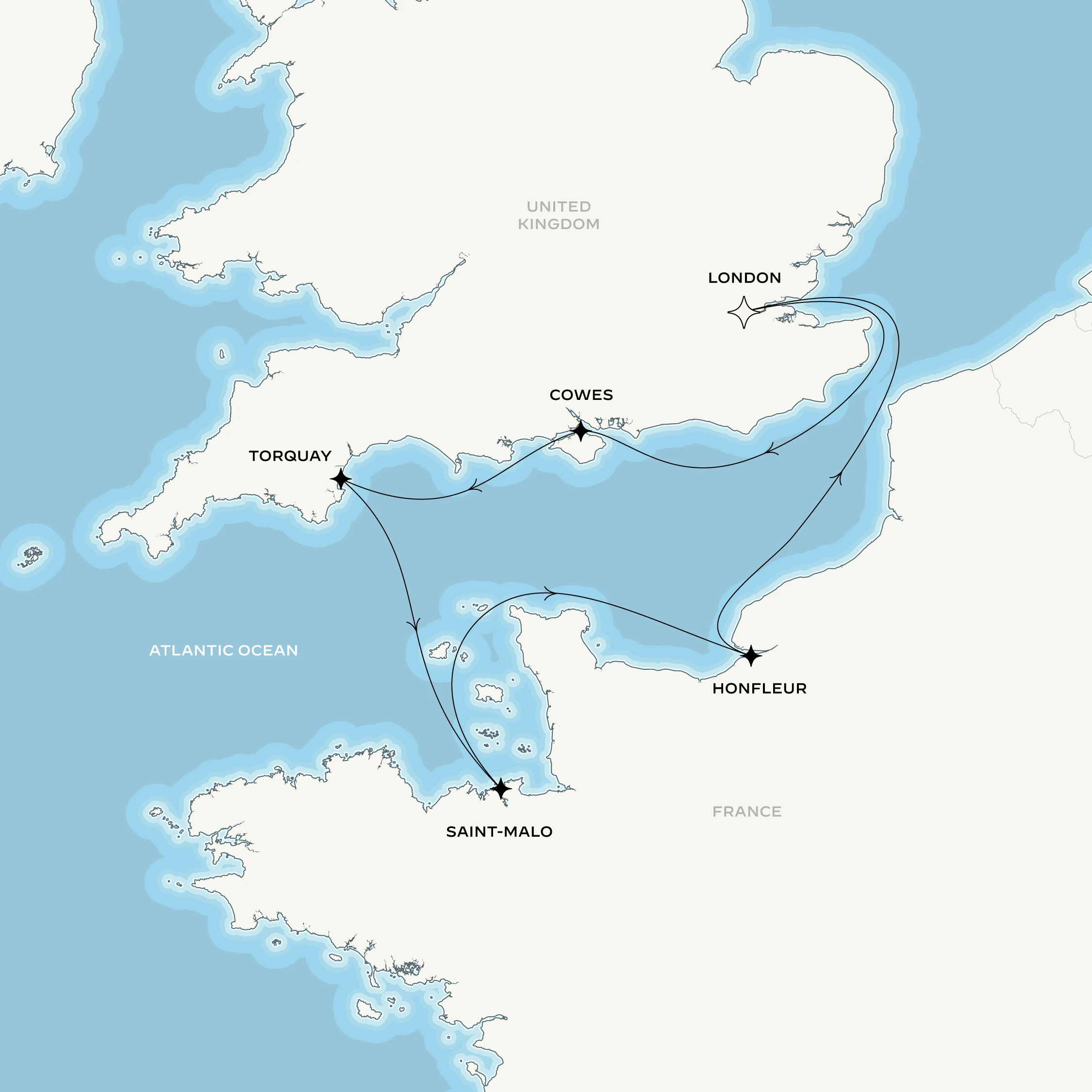 En quittant la capitale britannique, vous mettrez le cap sur Cowes, berceau de l’America’s Cup avant de rejoindre Torquay, ville d’Agatha Christie. Ensuite, direction Saint-Malo pour découvrir la cité corsaire ceinte de remparts, qui semble défier l'horizon. Deux jours plus tard, à Honfleur, ville de l’impressionnisme, vous déjeunerez dans un lieu prisé des artistes. Une journée en mer, et vous retrouverez Londres, la tête pleine de merveilleux souvenirs.