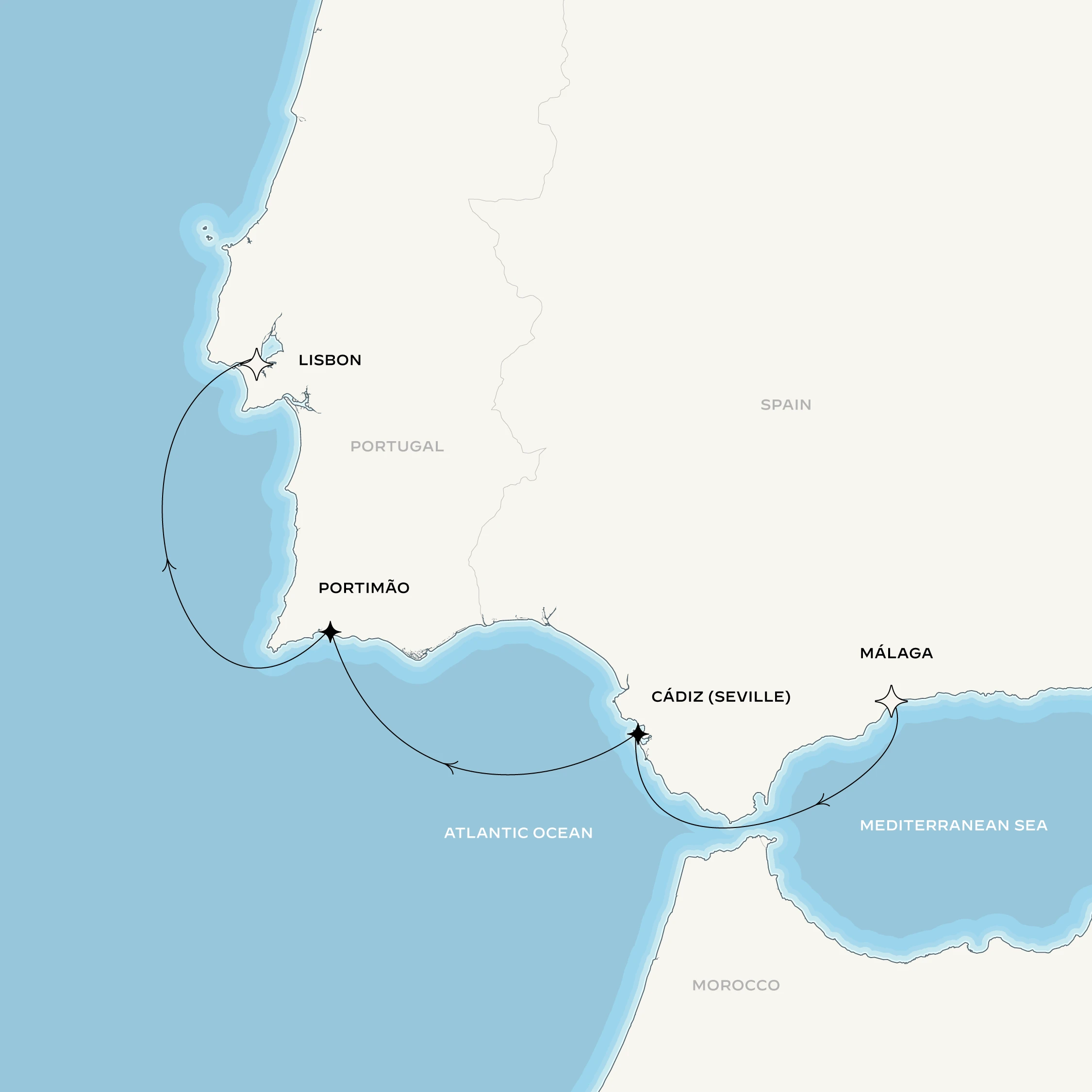 Vous prendrez la mer à Malaga pour rejoindre Cadix, qui saura, comme aucune autre évoquer les fastes du Siècle d’or espagnol. L’École royale d’art équestre vous ouvrira ses portes pour un dîner d’exception et une représentation dans la plus pure tradition andalouse. Puis, en empruntant le détroit de Gibraltar, vous passerez d’une mer à l’autre : de la Méditerranée à l’Atlantique. Face à l’océan, les falaises de l’Algarve se dressent fièrement et, à Portimão, vous ferez halte. Quand vous arriverez à Lisbonne, où votre voyage s’achèvera, pensez à ce qu’écrivait Saint-Exupéry : « Pour chaque fin, il y a toujours un nouveau départ… »