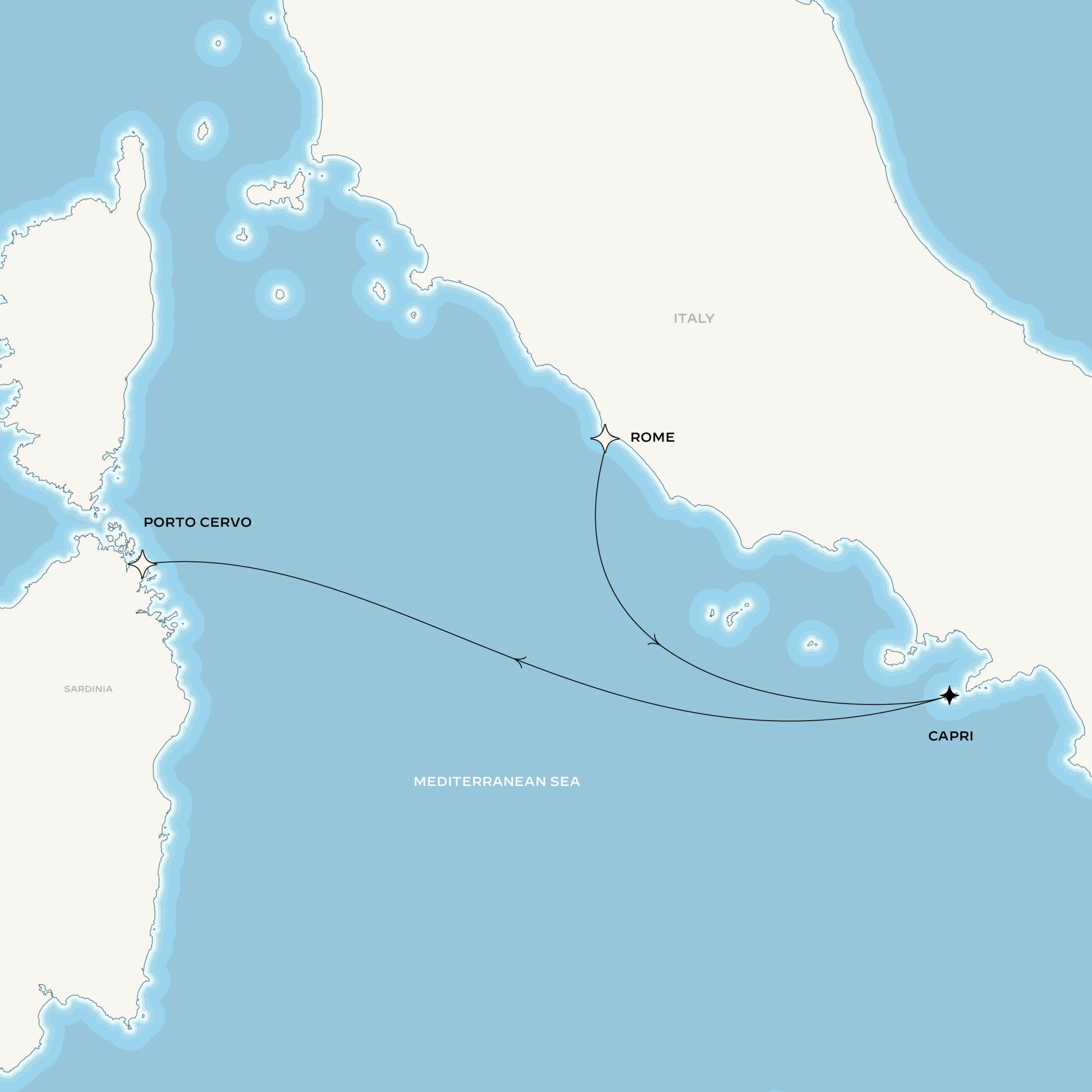 Partis de Rome, le vent vous portera jusqu’à Capri qui agit comme un aimant. Peut-être à cause du bleu de sa Grotta Azzura , de sa célèbre piazzetta, cernée de maisons blanchies à la chaux et de boutiques de luxe, là où se perpétue l’art d’observer sans être vu. Au terme de ce voyage, la luxueuse Porto Cervo vous ouvrira son Eden, dans une tout autre ambiance avec ses boutiques et sa marina prisée des plus beaux yachts.