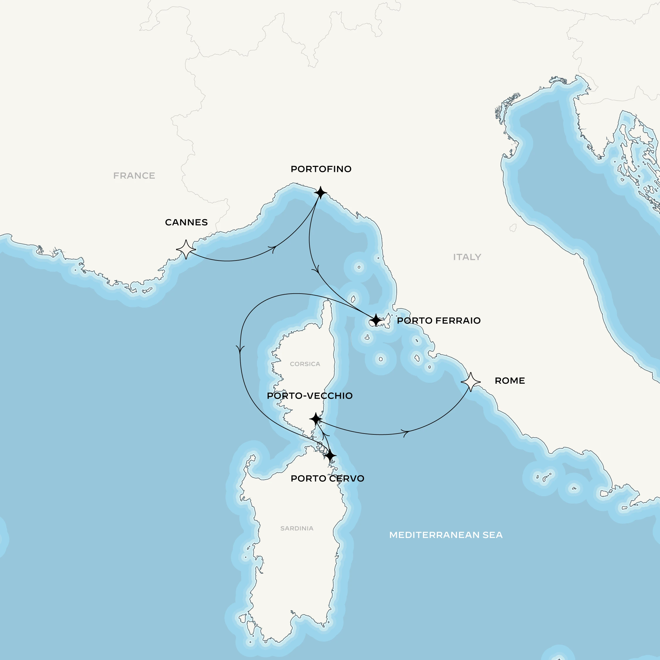 Après avoir quitté Cannes, vous naviguerez vers l’Italie. Première escale à Portofino, petit joyau italien caché au fond de sa crique pittoresque est un des plus beaux spots de la côte ligure. Sa magie opèrera dès les premiers pas sur sa corniche...À l’île d’Elbe ensuite, vous suivrez sur les traces de Napoléon. L’arrivée à Portoferraio, entre époustouflant promontoire naturel et remparts majestueux, est spectaculaire. Puis la luxueuse Porto Cervo vous ouvrira son Éden, deux jours durant, dans une tout autre ambiance, avec ses boutiques et sa marina prisée des plus beaux yachts. Le soir, vous serez conviés à une fête où le blanc immaculé sera tout à la fois règle et inspiration. Dernière escale à Porto-Vecchio où, perchée sur son rocher, sa citadelle règne sur un golfe couleur émeraude.