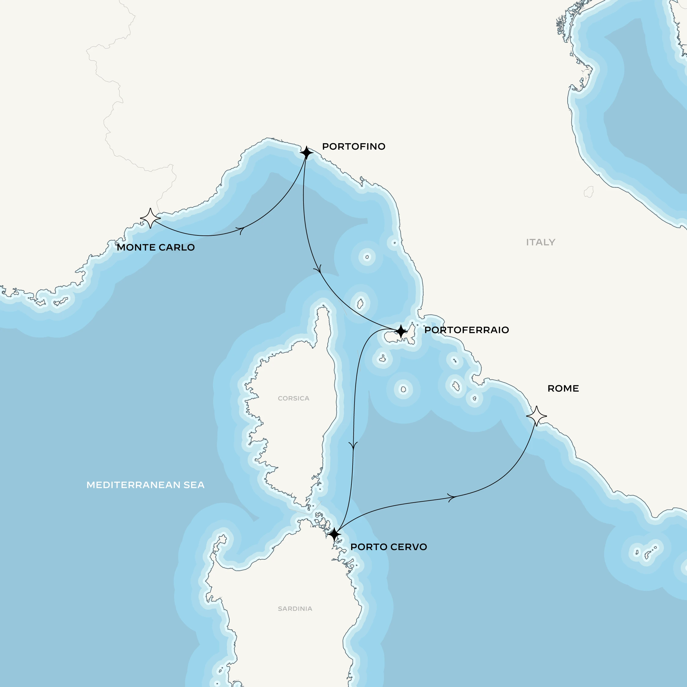 Après avoir quitté Monaco, vous naviguerez vers l'Italie pour une première escale à Portofino. Élégante, ravissante, intemporelle, dès les premiers pas sur sa corniche, la magie opère. Elle se poursuivra durant une journée entière, puisqu'un Riva vous mènera vers les plus beaux spots de la côte ligure. Puis cap sur l'île d'Elbe ou l'arrivée à Portoferraio, entre époustouflant promontoire naturel et remparts majestueux, est toujours spectaculaire. Vient la luxueuse Porto Cervo qui vous ouvrira son Éden deux jours durant, dans une tout autre ambiance, avec ses boutiques et sa marina prisée des plus beaux yachts. Vous en serez encore ébloui lorsque vous arriverez à Civitavecchia et que votre voyage s'achèvera…