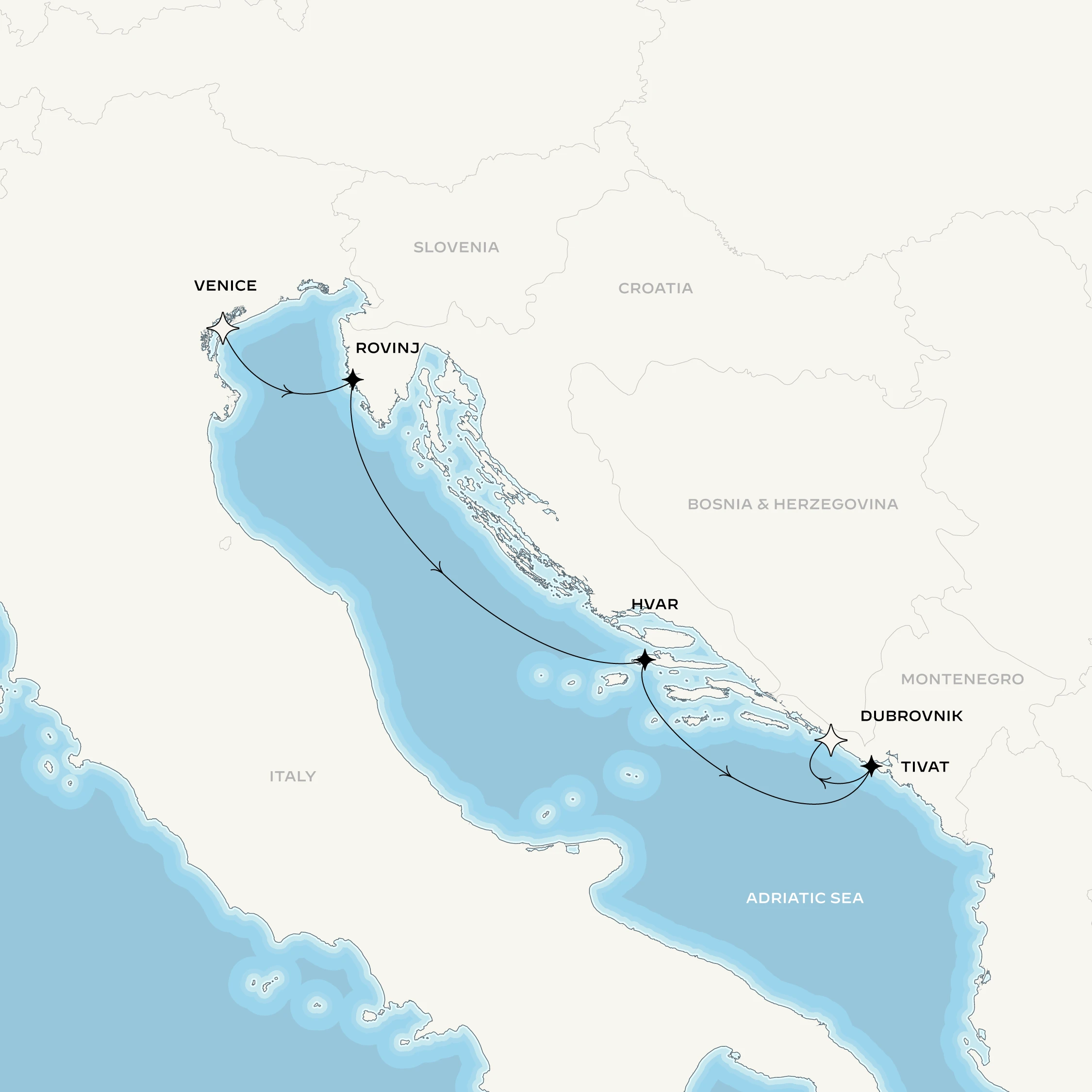 Partis de Venise vous gagnerez la Croatie, les maisons pastel et les couchers de soleil de Rovinj, petit bijou de l'Istrie. Vous succomberez alors au charme de l'une des villes les plus envoûtantes de la côte adriatique, de son port pittoresque et son dédale de ruelles pavées. Puis, cap sur Hvar, île réputée pour être la plus huppée du pays, avant de poursuivre en direction du Monténégro et les célèbres Bouches de Kotor inscrites au patrimoine mondial de l'UNESCO, avant de faire escale à Tivat, dont le raffinement n'est pas sans rappeler celui de Monaco… Dans une île forteresse, placée sous le signe de l'élégance et d'un légendaire agent secret, votre soirée aura le goût du mystère, de l'aventure et du glamour… Vous y penserez encore en rejoignant Dubrovnik, épilogue de votre voyage.