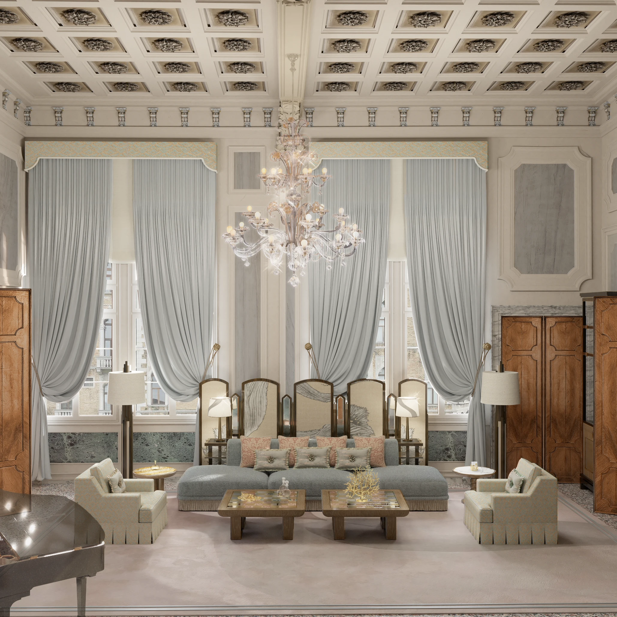 Il soffitto, decorato con raffinati motivi floreali, rappresenta il fulcro ornamentale della stanza. Al centro, un pianoforte a coda definisce l’atmosfera musicale, mentre lungo le pareti trovano spazio eleganti mobili bar. Concepita per contesti intimi, la sala ospita oggi cene private, cocktail, letture e spettacoli musicali, proseguendo con grazia lo spirito del suo passato.
