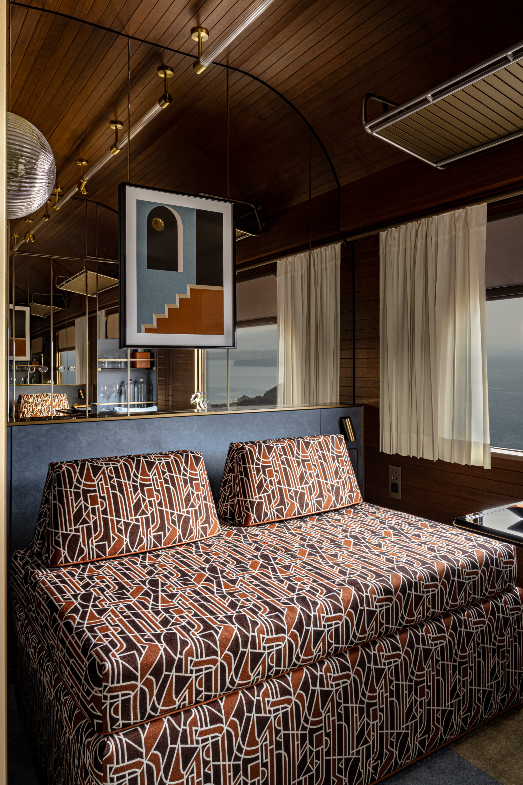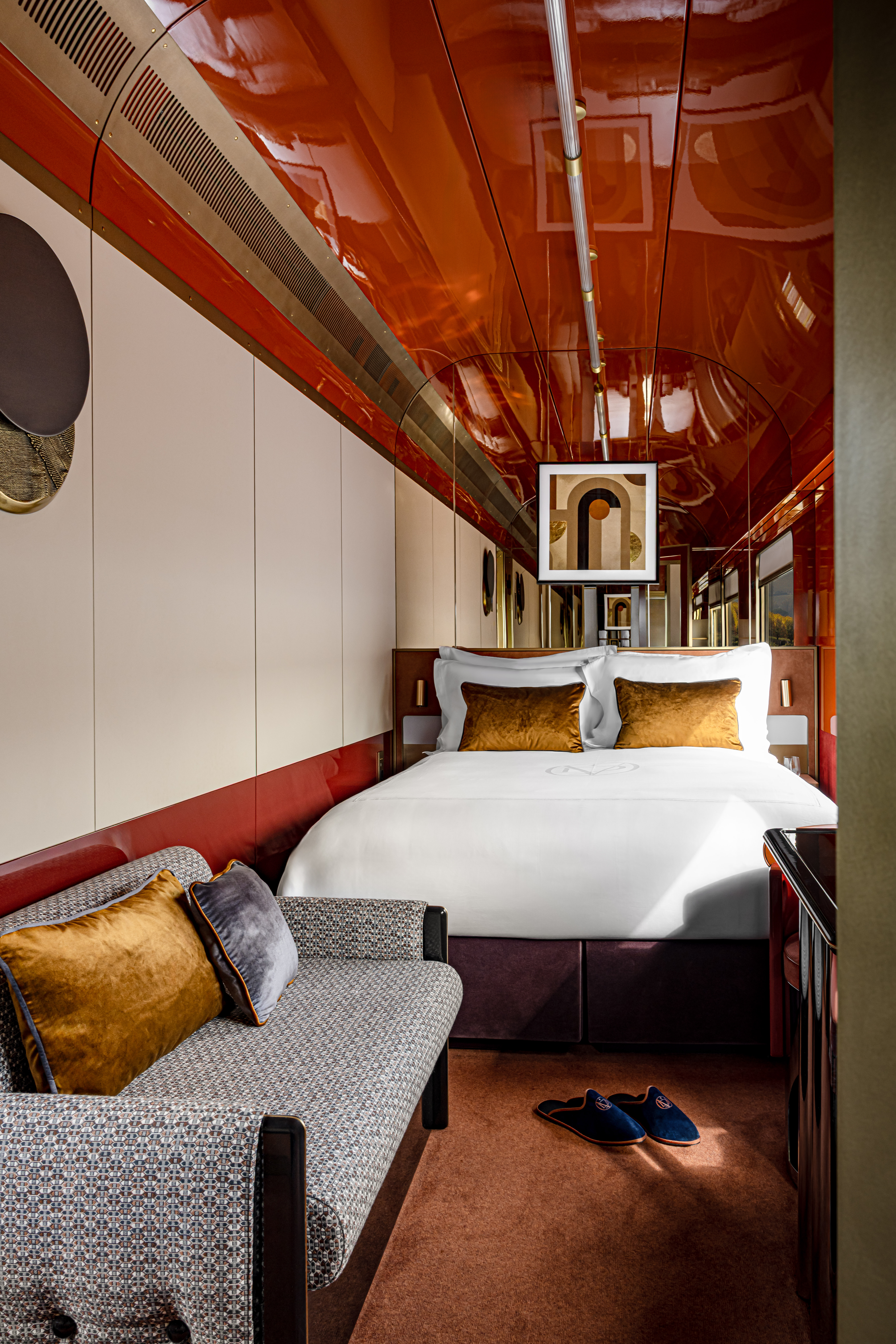 La cabine Deluxe se pare de teintes douces, de murs en miroirs et de plafonds en bois. Le canapé-lit se transforme en lit double, tandis que les repose-pieds peuvent également faire office de tables basses et de tabourets.
