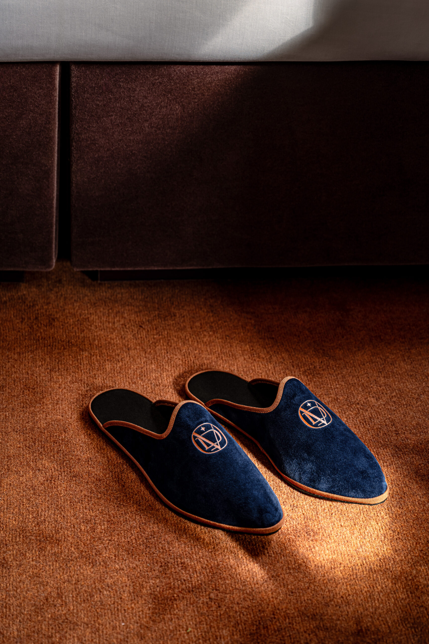 Un décor sophistiqué et chaleureux avec moquette au sol et lattes de bois au plafond.